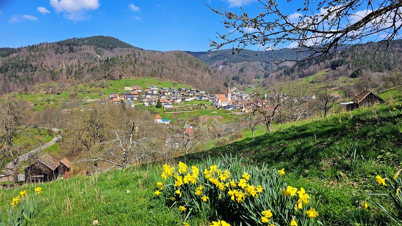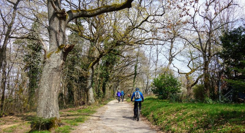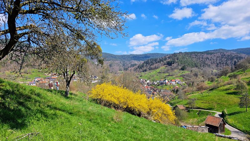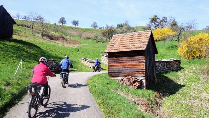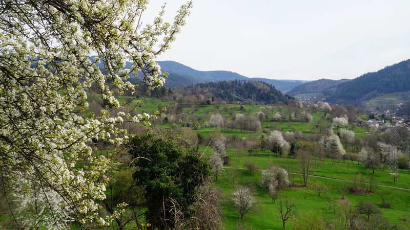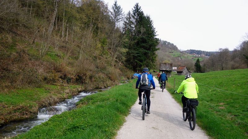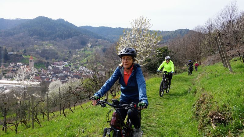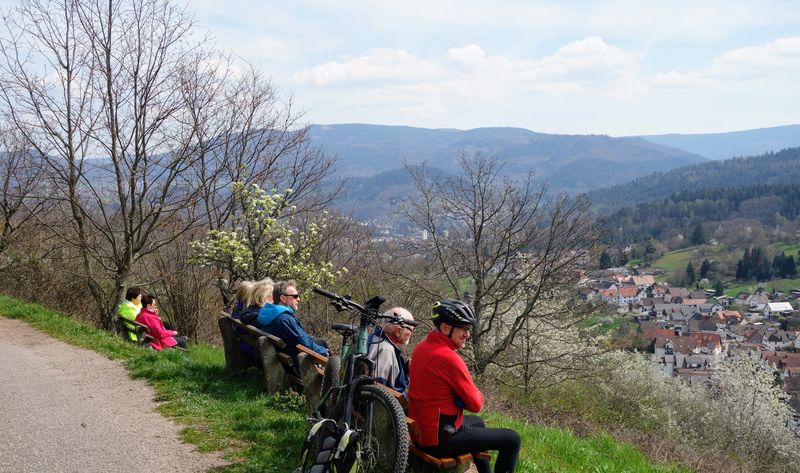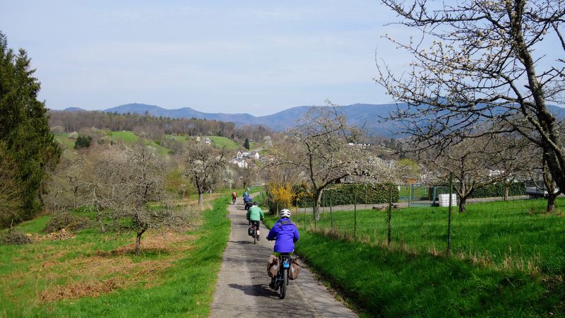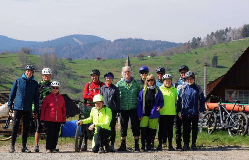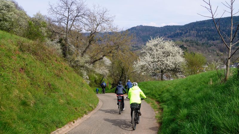 13 Radler des Alpenvereins Calw +Nagold reisten am Gründonnerstag 6. April 2023 ins Untere Murgtal. Der Frühling kehrt dort wie immer 2 Wochen früher ein wie bei uns im Kreis Calw und die Kirschennbäume standen schon in voller Blüte.