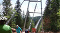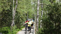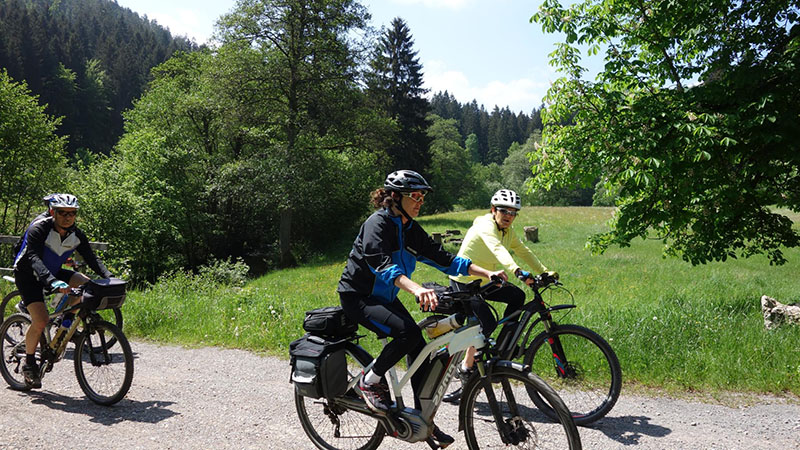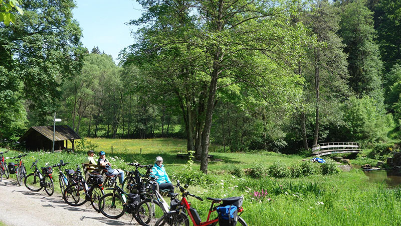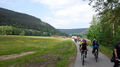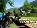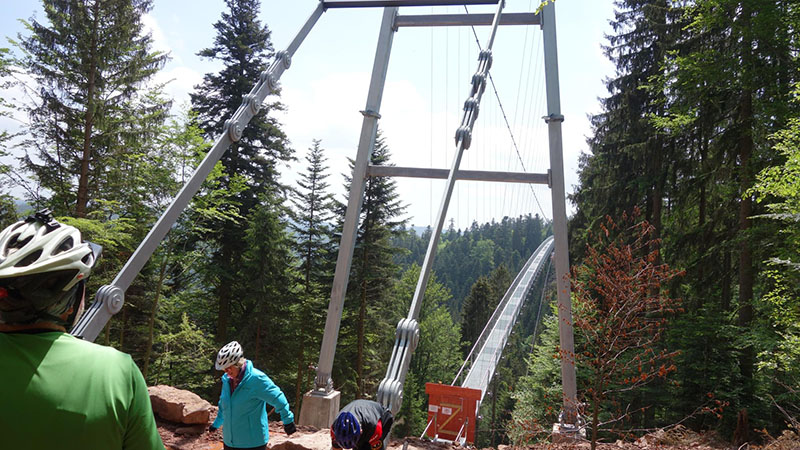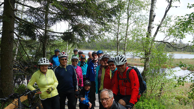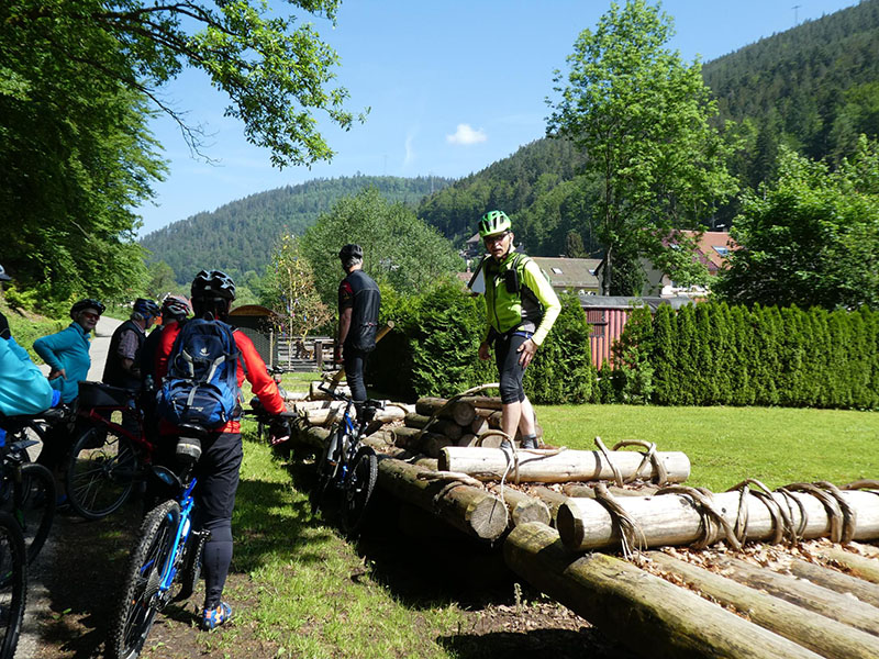 Von den 18 Teilnehmern waren immerhin noch fünf ohne Elektro-Unterstützung mit dabei. Von der Rehmühle ging es erst das Kleinenztal hinunter. Hier gibt es Infos und Zeugnisse aus der Zeit der Flößerei, die hier bis vor 100 Jahren betrieben wurde. Der erste Rad-Plattfuß musste am Kleinenzhof repariert werden. Zwischenziel war der Kurpark in Bad Wildbad. Von hier nahmen sieben Teilnehmer die Sommer-Bergbahn um sich mit dem Rad die 300 Höhenmeter-Auffahrt zu ersparen. Nach dem Vesper wurde die neu im Bau befindliche Hängebrücke über die Bärenklinge besichtigt. Die Grünhütte lies man links liegen und steuerte den Wildsee an. Die Räder wurden die 2 km über den Bohlenweg des Wildseemoores geschoben. Bei der rasanten Abfahrt hinunter nach Sprollenhaus waren plötzlich ein Smartphone und zwei Mann verschollen. Nachdem alles wieder beisammen war, konnte man angenehm den gut ausgebauten Enztal-Radweg nach Enzklösterle unter die Räder nehmen. Ab hier galt es den letzten strengen Anstieg hinauf auf den Aichelberg zu bewältigen. Etwas zeitversetzt trafen die zwei Leistungsgruppen und der erneut verschollene Mann im Landgasthof „Grüner Baum“ in Aichelberg ein.