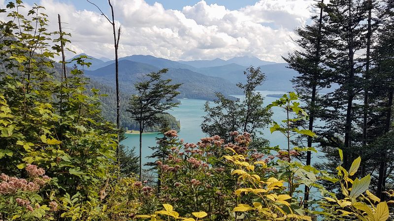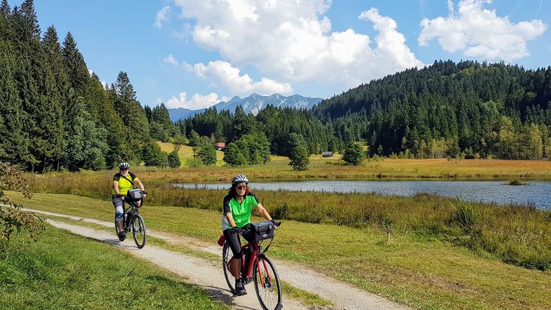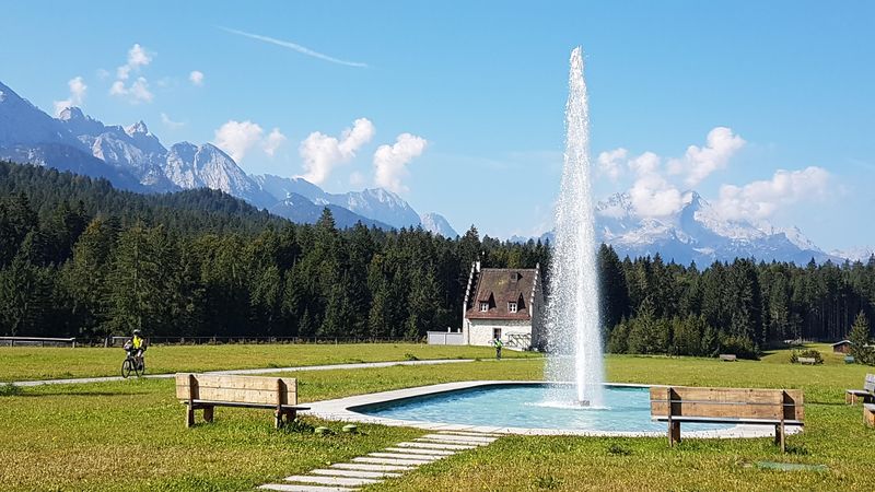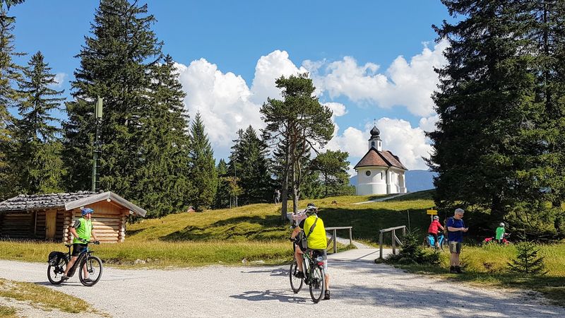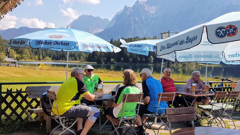 Treffpunkt der Wanderer und Radfahrer war auf dem Parkplatz am Pflegersee oberhalb von Garmisch-Partenkirchen. Reinhold und Stephan radelten von dort aus an der Loisach entlang nach Eschenloe und zurück über Partenkirchen nach Grainau. 45 Km. Rolands Biketour führte ihn zum Schachenhaus (1866m), dem Jagdhaus von König Ludwig II und den dortigen Botanischen Alpengarten. 60 km, 1600 Hm.