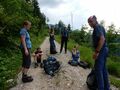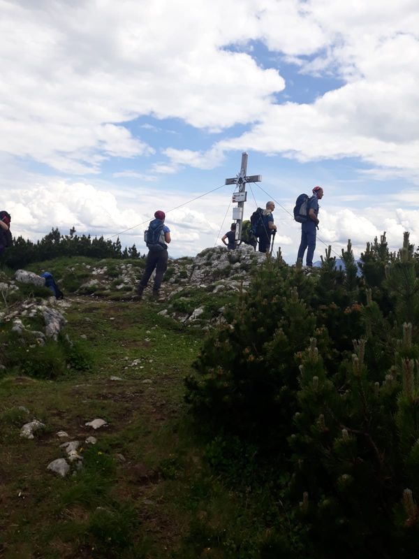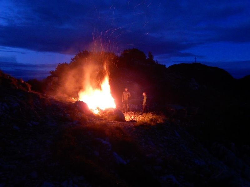 Am Samstagfrüh fuhren wir weiter an den Traunsee. Vom Umkehrplatz am Ostufer ging es über den Naturfreundeklettersteig ca. 1200 Höhenmeter hoch. Zwischendurch hatten wir traumhafte Ausblicke auf den Traunsee und die Umgebung. Kurz vor dem Naturfreundehaus unterhalb des Gipfels wurden wir am Nachmittag noch von einem kurzen, aber heftigen Gewitter erfasst, es hieß: weg vom Seil und abwarten. Nach 30 min konnten wird dann durchnässt vollends bis zum Naturfreundehaus hoch, wo wir uns kurz stärkten und aufwärmten. Unser Übernachtungsziel war jedoch die Gmundner Hütte ein Stück weiter oben, welche wir dann auch nach kurzer Zeit erreichten. Dort konnten wir in der Gaststube alles zum Trocknen aufhängen und bekamen ein leckeres Abendessen, sehr zu empfehlen sind die Kasspressknödel! An diesem Wochenende war Sommersonnwende und in der Region ist es Brauch, am Samstagabend auf allen Gipfeln ein Feuer anzuzünden. Das Wetter hatte sich wieder gebessert und wir hatten einen wunderschönen Rundblick auf alle umliegenden Gipfel bis zum Dachstein mit ihren Feuern. Natürlich hatten wir auch ein Feuer!