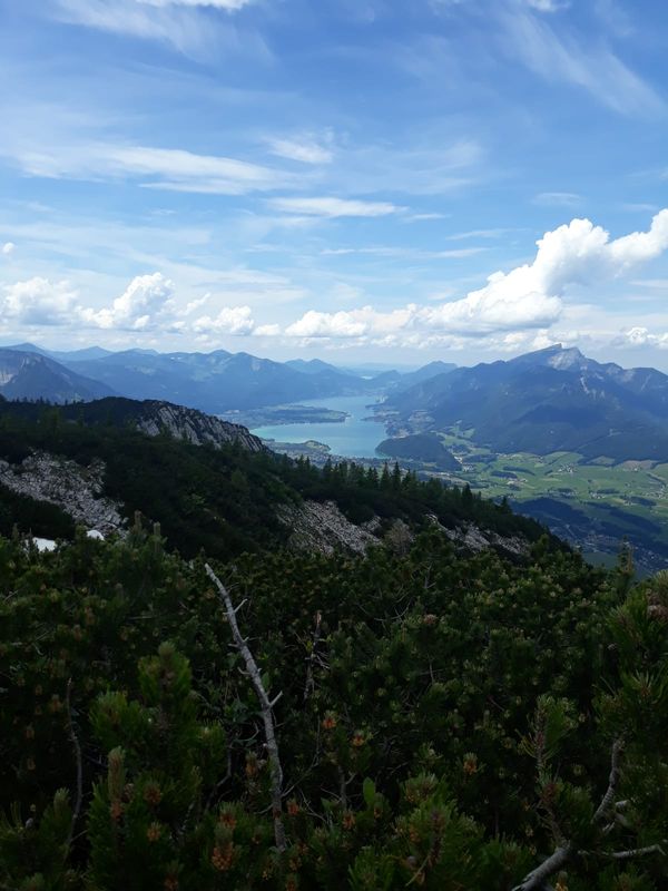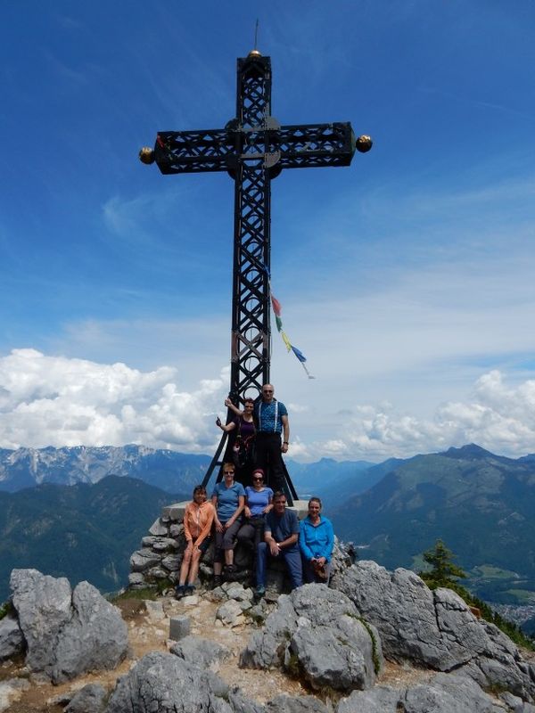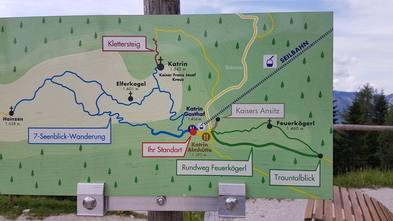 Am Freitagmorgen fuhren wir mit der Seilbahn bis zur Katrin Almhütte auf, von dort ging es auf einem 40 minütigen Wanderweg zum Einstieg des Katrin-Klettersteigs, welcher am Gipfel beim Kaiser Franz Josef Kreuz endet. Von dort wanderten wir weiter zu den Gipfeln Elferkogel und Hainzen, zwischendurch hatten wir wunderschöne Ausblicke auf die Seen im Tal, der Weg heißt nicht umsonst 7-Seen-Blick Rundwanderweg: Hallstättersee, Wolfgangsee, Nussensee, Fuschlsee, Schwarzensee , Mondsee und Tachinger See. Da wir noch nicht genug hatten, wanderten wir weiter über luftige Grade bis zum Rosskopf. Von dort aus folgte der lange Abstieg ins Tal, wir kamen doch recht spät unten an. Nach Bad Ischl waren es jedoch noch über 6 km Gehstrecke, daher beschlossen wir aufgrund der fortgeschrittenen Tageszeit zu trampen, was auf Anhieb gelang. In dem Moment begann es auch zu regnen, wir hatten einen Glückstag!