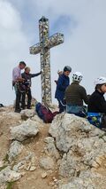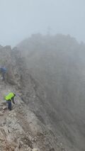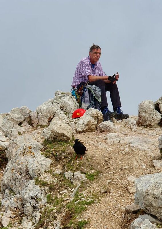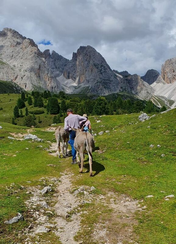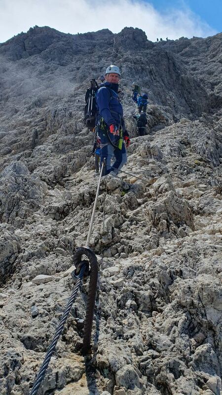 Gut erholt starteten wir am Donnerstag zu unserer letzten Tour, die Überschreitung des Sass Rigais(3025m), dem Hauptgipfel der Geislerspitzen. Dunkle Wolken waren bereits am Himmel, trotzdem sind wir zu neunt aufgebrochen. Ein entspannter Wanderweg mit viel Abwechslung durch Eseln, Pferde, Murmeltiere oder Edelweiß am Wegrand führte zum Klettersteig. Bei leicht einsetzenden Regen beschlossen nach einigen Diskussionen und Überlegungen 4 Teilnehmer umzukehren, so dass wir nur noch zu fünft waren. Mit bangem Blick nach oben sind wir dennoch über den Klettersteig des Süd-West-Grats bis zum Gipfel aufgestiegen. Dort gab es für Birgit eine Premiere, der 1. Gipfel über 3000, leider ohne die erhoffte, fantastische Aussicht. Beim Abstieg über den Ostanstieg musste noch ein breiter Felsspalt, für kleine Personen durchaus anspruchsvoll, und eine gut gesicherte, senkrechte Passage überwunden werden. Weiter ging es über ein Schotterfeld hinab, bevor wir dann wieder den Wanderweg erreichten. Nun erwischte uns doch noch ein stärkerer Schauer und wir eilten zielstrebig zur Regenburger Hütte. Auf den letzten Metern kam dann die Sonne zum Vorschein und so konnten wir bei der Ankunft noch gemütlich auf der Terrasse sitzen und uns trocknen lassen. Nach dem Abendessen war natürlich noch eine Runde Schnaps fällig, für den ersten 3000er von Birgit.