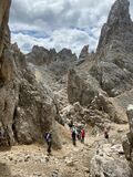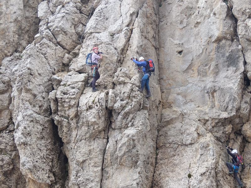 Der nächste Tag begann mit einem kurzen Sparziergang zur Liftstation Paolina, bei leicht einsetzenden Regen. Glücklicherweise hörte es auf zu regnen und wir starteten nach der Auffahrt mit dem Lift unsere Tour an der Paolina Hütte(2125m). Anfangs noch ein entspannter Pfad, ging der Weg immer steiniger und steiler werdend hoch zum Vajolonpass(2560m). Dann erfolgte der Einstieg in den Klettersteig über den Nordgrat zum Rotwandgipfel (2806m), mit herrlichen Blicken in die Tiefe und auf die Felsspitzen der Rosengarten Gruppe. Bei schnell wechselnden Sichtverhältnissen musste das Timing zum Fotografieren allerdings passen. Beim Abstieg über den Ostgrat musste noch eine schwierige Stelle, eine steile mit Klammern versicherte Wand hinauf zum Fensterlturm bewältigt werden, bevor das Ende des Klettersteiges erreicht war. Unter fachmännischer Anleitung und Unterstützung von Stefan und Patrick sind alle gut durchgekommen. Danach erfolgte der Abstieg zur Rotwandhütte. Kurz nachdem wir die Hütte erreicht hatten, ging ein kräftiger Schauer herunter und wir waren froh im Trockenen sitzen zu können. Wir stärkten uns nochmal für den Rückweg und sind dann heil und trocken an der Unterkunft angekommen. Auch heute gab es ausgezeichnetes Essen und einen Gratisschnaps.