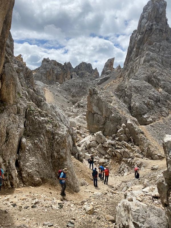Am Dienstag stand eine lange Tour durch den Latemar auf dem Programm. Nach dem Frühstück fuhren wir mit dem Bus nach Obereggen und von dort mit der Bergbahn nach Oberholz (2096m). Auf dem Serpentinenweg Nr.18 ging es stetig bergauf durch das schroffe Felslabyrinth zur Gamsstallscharte (2564m). Dann führte der Weg über eine Hochfläche zur Rotlahnscharte (2600m), dem Einstieg zum Klettersteig. Nach einer kurzen Stärkung und Anlegen der Ausrüstung ging es durch den Campanili-Klettersteig, welcher größtenteils horizontal verläuft, bis zur großen Latemarscharte (2620m) mit dem Biwak. Bis zum Gipfel (2800m) mussten wir nach einem kurzen Abstieg noch ca. 200m über alpines, schroffes Gelände mit ungesicherten Kletterpassagen aufsteigen. Das Gipfelkreuz im Blick machten wir nochmal eine Rast, um uns für den bevorstehenden Abstieg zu stärken. Der Weg mit vielen Kletterpassagen führte noch lange quer verlaufend zur kleinen Latemarscharte (2526m). Dann endlich ging es in Serpentinen stetig bergab bis zum Karer Pass. Die Zeit war schon fortgeschritten, die Gruppe wurde immer schweigsamer und so langsam machte sich Müdigkeit breit. Zu relativ später Stunde, gegen 20.30 Uhr, sind wir nach einem langen Tag erschöpft am Karer Pass angekommen und waren froh noch rechtzeitig vor dem einsetzenden Gewitter zurück zu sein.