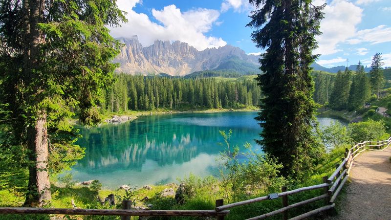 Zu elft sind wir am Sonntag um ca. 8 Uhr zu unserer Klettersteigtour losgefahren. Nach der langen Anfahrt sind wir gegen 16 Uhr bei der Unterkunft, der Pizzeria Antermont, am Karer Pass angekommen. Als erstes gönnten wir uns ein kühles Getränk auf der Terrasse und konnten dabei schon mal den Blick auf die bevorstehenden Gipfeltouren genießen, mit der Rotwand und dem Latemar. Nachdem wir die komfortablen Zimmer bezogen hatten, machte sich eine kleine Gruppe auf den Weg zum malerischen Karer See. Bei der Umrundung ergaben sich immer wieder fantastische Blicke auf das türkisblaue Wasser und viele Spiegelungen der Latemartürme im See. Für Hobbyfotografen eine Vielzahl an einmaligen Motiven. Zum Abendessen kamen dann alle wieder erfrischt und gut gelaunt zusammen. Nach dem Essen gab es von Stefan noch einen kurzen Ausblick auf die bevorstehende Tour, den Rotwand-Klettersteig, und von der Wirtin einen Zirbenschnaps.