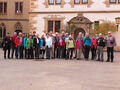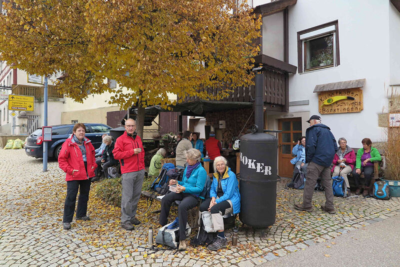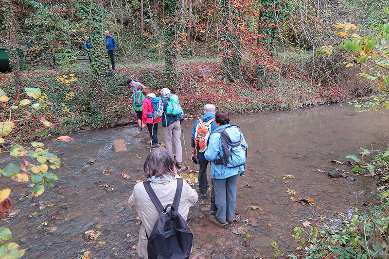 Mit der Kulturbahn fuhren wir 9.40 in einer halben Stunde ohne Umsteigen von Nagold nach Mühlen. Schnell noch die restlichen Essenswünsche für die Schlusseinkehr in die Liste eintragen, und dann ging´s los. Der Neckarweg läuft anfangs auf dem gleichnamigen Radweg, aber bald bogen wir ab auf einen schönen Waldweg durch den Auwald. An der ehemaligen Kohlensäurefabrik bei Eyach stießen wir wieder auf den Radweg, auf dem wir bis nach Börstingen weitergingen. Radfahrer sahen wir nicht, es war wohl noch zu kalt morgens. Dort stärkten wir uns bei der halbstündigen Mittagspause an der Kunstköder-Schmiede Börstingen für den Aufstieg zum Schloss Weitenburg. Nach dem steilen Hundert-Meter-Anstieg auf schmalem Waldpfad verschnauften wir im Schlosshof, dann verlief der Weg abwärts durch den bunten Herbstwald zum Neckar nach Bieringen. Über den Sebastian-Blau-Weg kamen wir nach Bad Niedernau in den Kurpark des ehemaligen Sanatoriums. Dort musste der Katzenbach überquert werden, aber die Brücke war abgebaut. Als Ersatz hatte man einige Steine ins Wasser gelegt. Es hatte an den vorherigen Tagen wohl so viel geregnet, dass die Wasseroberfläche leicht oberhalb der Steinoberfläche verlief. Einige nahmen die Herausforderung an, andere gingen zurück und überquerten den Bach am Sanatorium. Die „Mutigen“ konnte man an den (nassen) Füßen erkennen. Der ansteigende Weg oberhalb des Neckars bot beeindruckende Ausblicke über die bunten Wälder im Neckartal. Pünktlich gegen 16.30 erreichten wir den Gasthof Hirsch zur Schlusseinkehr. Wir wurden gut und dank der Vorbestellung auch sehr zügig bewirtet. Unser Zug fuhr allerdings erst 19.37. So machten wir noch einen abendlichen kurzen „Verdauungsspaziergang“. Rottenburg-Kenner Roland zeigte uns einige der schönsten Winkel Rottenburgs, seinem 30-jährigen Arbeitsplatz, bevor wir zufrieden mit dem schönen Tag die Heimreise antraten.