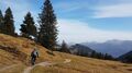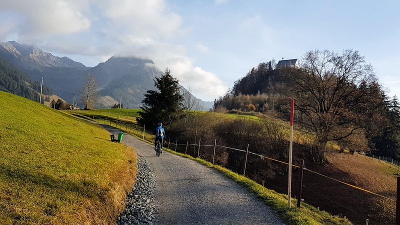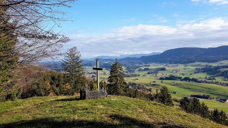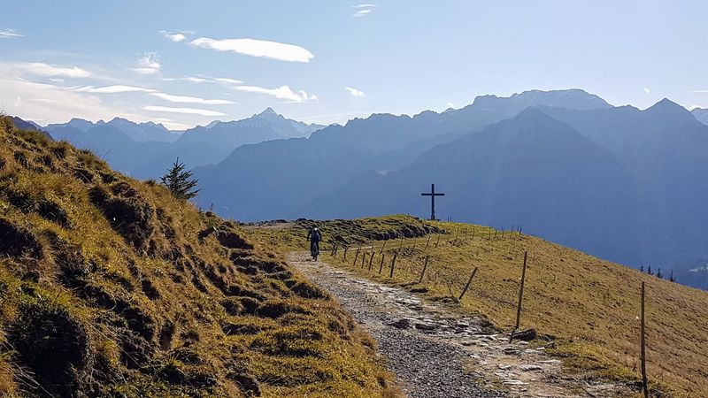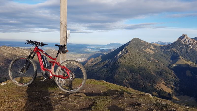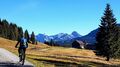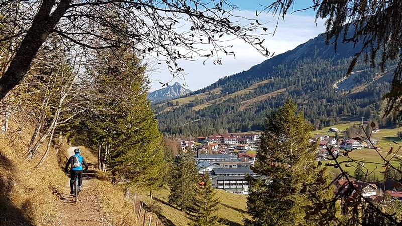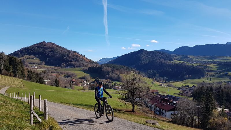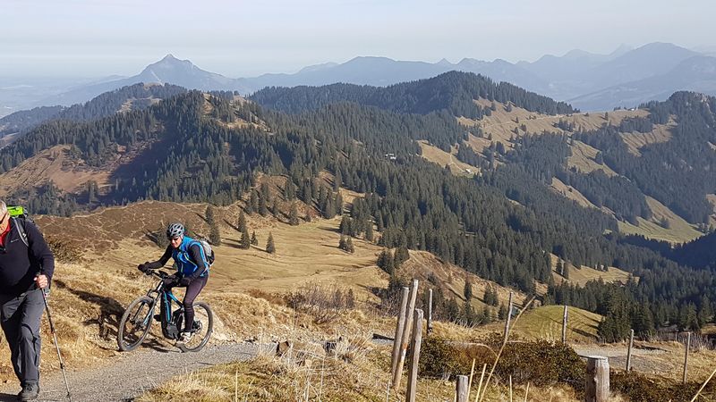 Die erste Tour führte hinauf auf das Riedberger-Horn 1.787 m. Ein breiter fahrbarer Weg führt hier hinauf bis 100 Meter unter dem Gipfel. Nach dem Weiherkopf und Rangiswangerhorn ging es rasch das Ostertal hinaus ins Gunzesriedertal. Von hier führt ein steiler Alpweg den sonnenbeschienenen Südhang hinauf auf den Mittagberg 1.451 m. Nach Gunzesried und Sonthofen war man bald wieder in Fischen. Am Westhang des Rubihorn scheinte noch die Sonne. So bot sich noch die Befahrung des Wallraffweg an mit seinen schönen Panorama-Aussichten. Kein einziger Fußgänger war hier unterwegs. Mit 70 km und 2.200 Höhenmeter war dieser sonnige Herbsttag bestens ausgenützt.