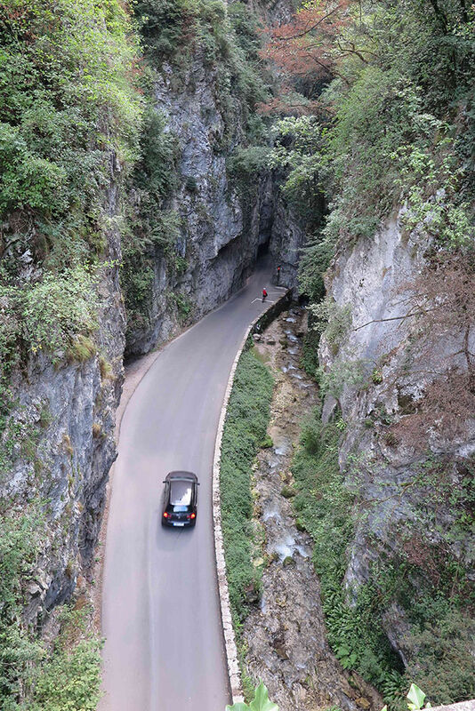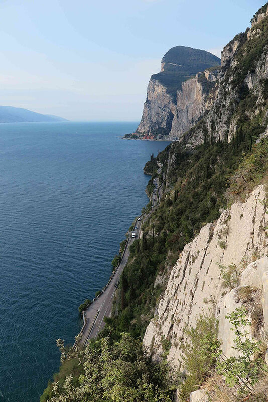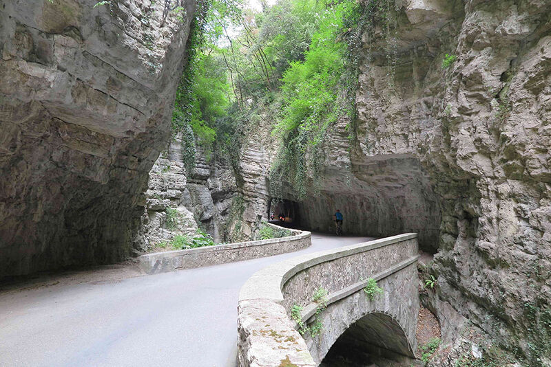 Am Freitag machten wir dann noch zwei kurze Touren aus dem MTB-Angebot des Hotels: zunächst „Forra´s Canion“. Durch Pieve abwärts durch Brasa Richtung Campione del Garda. Nur abwärts durch eine enge Schlucht mit Wasserfällen, kurzen Tunneln auf einer 1913 gebauten Straße in einer wunderbaren Felslandschaft mit fantastischen Aussichten auf den Gardasee und die Küstenstraße. Bei der Rückfahrt waren wir von der Schönheit der Schlucht so fasziniert, dass wir die Steigung fast nicht spürten.