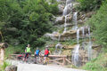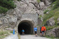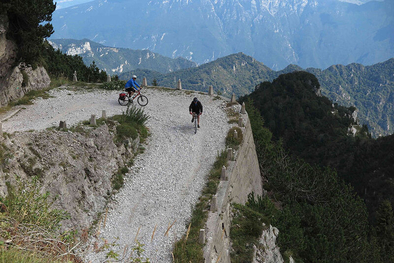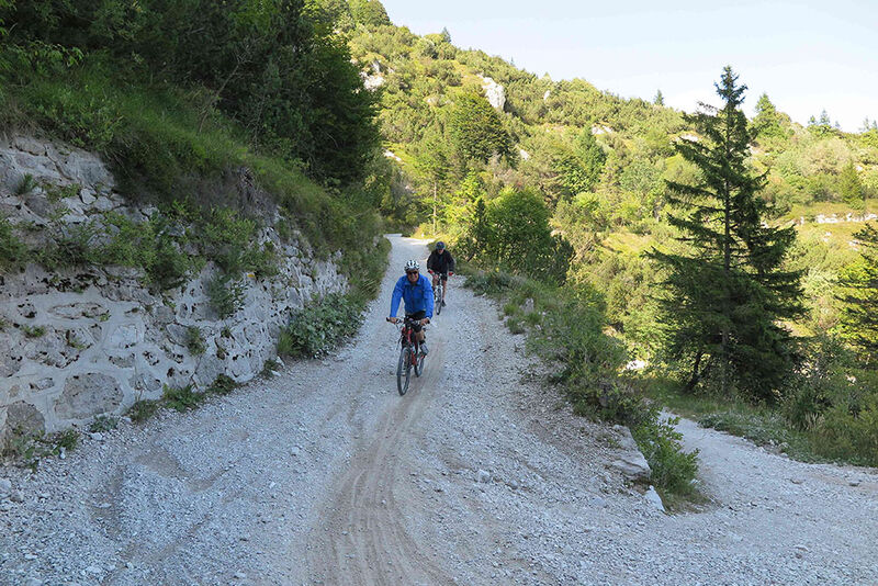 Zunächst 5km und 200Hm auf richtigen Bergsträßchen, dann abwärts auf guter Schotterstraße bis San Michele. Von da an ging´s bergauf, Schlaglochstrecken wechselten mit Schotter und saumäßig steilen Stellen. Und das 16 Kilometer lang! Meistens schonten wir unsere Ketten und strapazierten unsere Schuhsolen, und der Schweiß lief in Strömen, obwohl wir häufig im Wald liefen. Immer wieder schöne Aussichten, der hohe Pisù-Wasserfall war sehr beeindruckend. Immer weiter aufwärts, fast oben zogen wir uns bei 120C und kaltem Wind wärmere Kleidung an und stärkten uns vor dem letzten Anstieg zum Tunnel in der Passo Tremalzo Albergo Garda. Dort sahen wir auch zum ersten Mal am Tage andere Radfahrer, und zwar jede Menge. Die waren wohl die Straße hochgekommen oder hatten sich vom Shuttle bringen lassen. Dann ging´s nochmal hoch, durch den Tunnel auf 1850m in eine andere Welt: grandiose Aussichten, steile Abfahrten und enge Kehren und alles im Schotter, der uns viel abverlangte. Immer wieder anhalten, Bremshände ausschütteln und Landschaft genießen. Aber nur noch bergab – dachten wir. Am Passa Nota gönnten wir uns noch eine Trinkpause. Als wir weiterfahren wollten, hatte sich die Luft aus Reinhold´s Hinterrad verabschiedet. Schlauch wechseln, der Hüttenwirt kam mit einer Luftpumpe!, weiter ging´s – und dann schon wieder bergauf. Aber nicht so weit, einige für uns nicht fahrbare Felsdurchbrüche, und endlich bei Vesio wieder auf eine Teerstraße. Wir wussten fast nicht mehr, dass Räder so leise abrollen können. Nach einigen kurzen Verhauern erreichten wir dann unser Hotel Lucia von oben an den Tennisplätzen und trugen die Räder die letzten Meter die Treppen zur MTB-Garage hinunter. 53 Kilometer und 1850 Höhenmeter hatten wir geschafft und uns so ein oder zwei isotonische Weizenbiere zum Flüssigkeitsausgleich verdient.