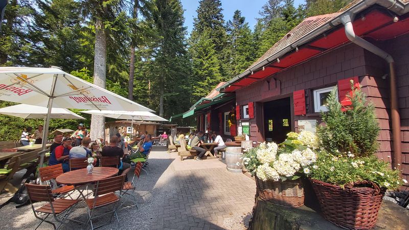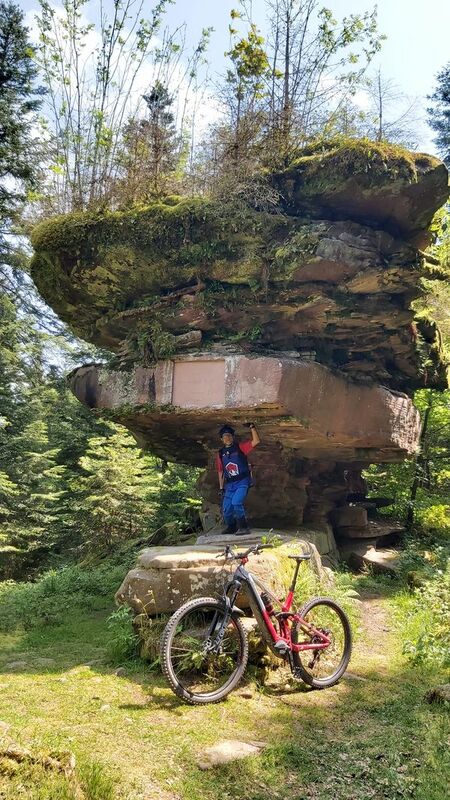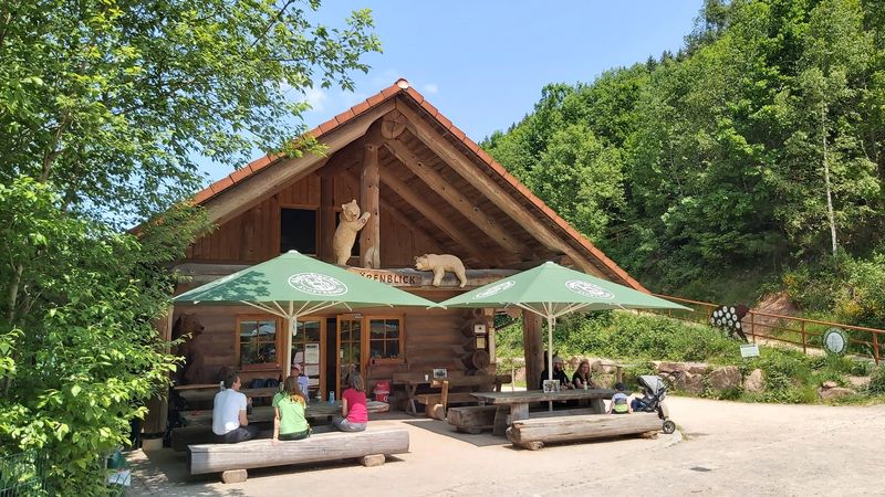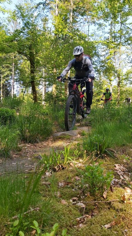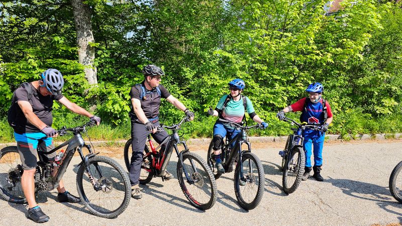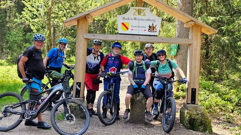 Nach etwa einem halben Kilometer einrollen ging es gleich auf den ersten Trail im Teuchelwald. Die heutige Tour verläuft auf den ersten 15 km auf engen, wurzeligen Waldpfaden, gesäumt von uralten Grenzsteinen. Vor einer rasanten Abfahrt ins Tal, machten wir am Schmidberger Platz eine kleine Verschnaufpause und trafen pünktlich zur Mittagszeit im Bärenpark in Bad Rippoldsau Schappach ein. Nach unserer Rast und kurzen Besuch am Bärengehege ging es auf sonnigen Pfaden in halber Höhe weiter. Das Wetter war wunderbar warm und die Aussichten waren traumhaft schön - Schwarzwald in seiner schönsten Form. Ein weiters Highlight war der Burgbachwasserfall mitten im Wald. Für den Aufstieg zum Kniebis wählten wir die Forststraße und strampelten die ca. 350 HM zügig hoch. Vorbei am Kastelstein passierten wir den Kniebis und ließen es bequem wieder zurück nach Freudenstadt rollen. Die Schlusseinkehr machten wir im urigen Waldcafe.