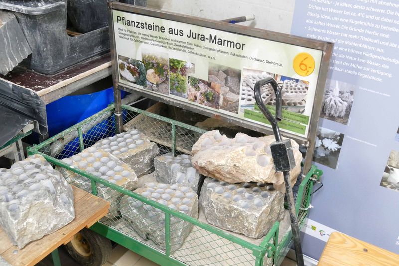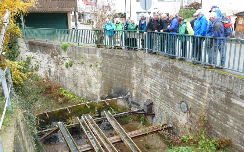 Die Dozentin hatten wir über unsere Verspätung informiert. Sie erwartete uns am Seebach an der Kugelmühle. Dort zeigte sie uns die Apparatur in Funktion, in der mit Wasserkraft aus den Rohlingen des Alb-Marmors runde Kugeln entstehen. Anschließend informierte sie im ehemaligen Waschhaus – heute Produktionsstätte der Rohlinge und Verkaufsraum der fertigen Kugeln – über Produktion der Kugeln und über die Gesteine Württembergs. Aus Zeitgründen verzehrten wir nebenher unser Mittagsvesper.