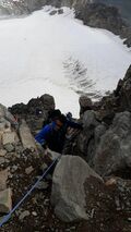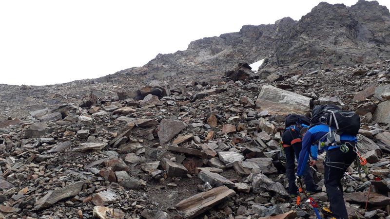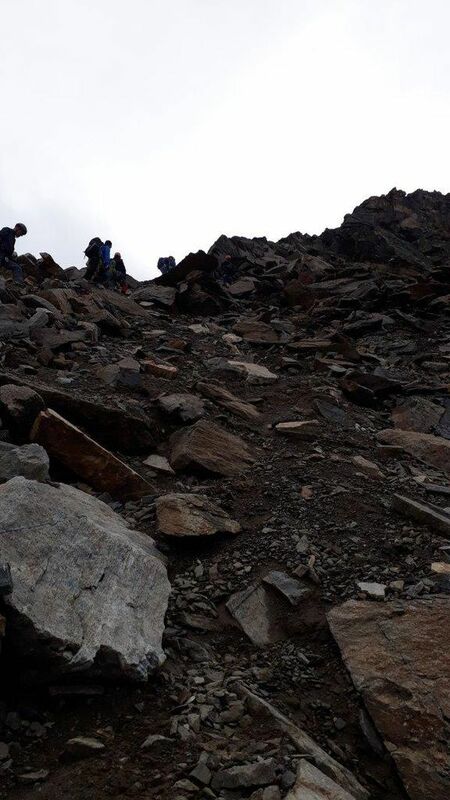 Nach einer kurzen Rast, wurden zwei 3er Seilschaften und eine 4er Seilschaft gebildet, die dann über die Westflanke zum Nordwestgrat und über diesen durch den sogenannten Kamin zum Gipfel auf 3312m. kletterten bzw. stiegen. Die ausgesetzte Schlüsselstelle im Kamin wird mit 3 UIAA bewertet.