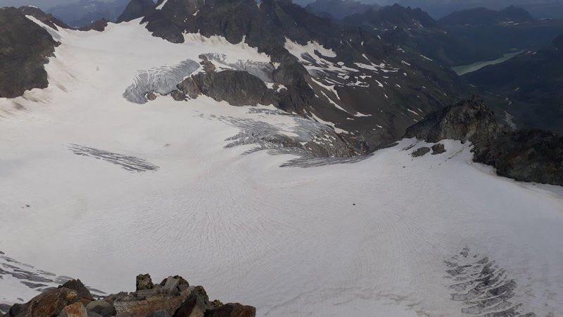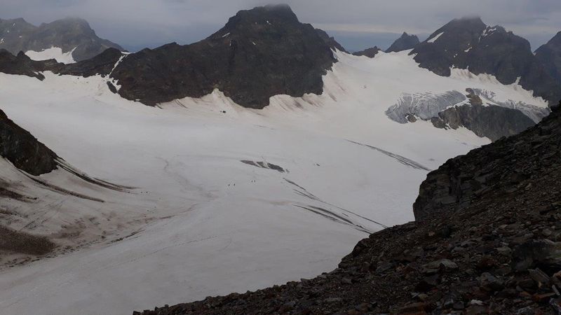 Gegen 10.30 waren alle wieder in der Buinlücke und begingen nun wieder in zwei Seilschaften den Gletscher im Abstieg. Mit erreichen des Gletscherende öffnete der Himmel seine Pforten.