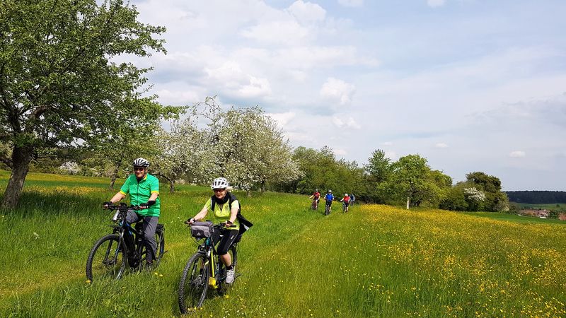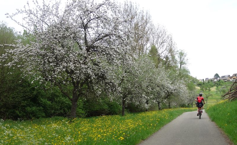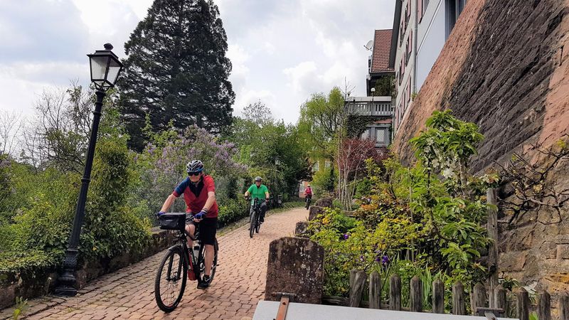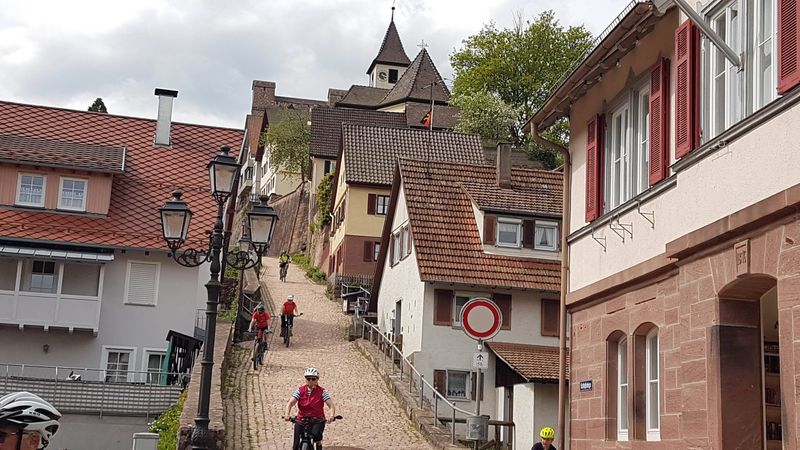 Durch blühende Streuobstwiesen ging es über Rotfelden, Wenden und Gaugenwald das Bruderbachtal hinunter nach Berneck. Das historische Kopfsteinpflaster der schönen Schloßsteige war für einige Radler ungewohnt, so dass diese ihr Rad das Städtle hinunter schoben.