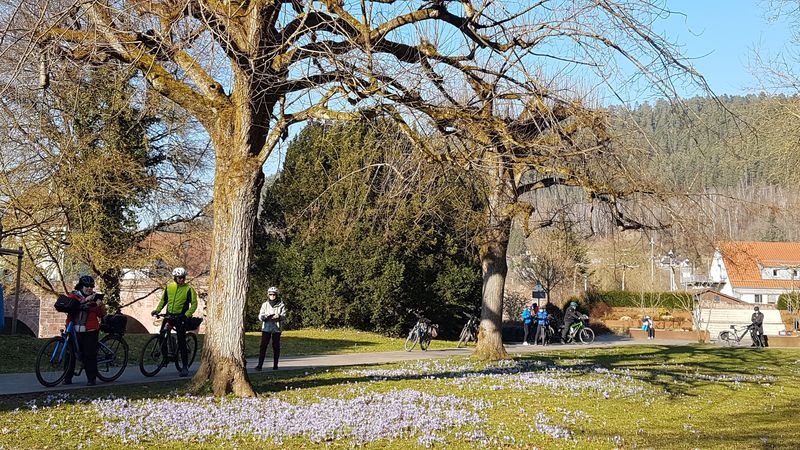 Nach kalter Frostnacht traf sich die Gruppe auf dem sonnigen Marktplatz in Calw. Spätestens bei der Auffahrt nach Alzenberg und Altburg wurde es jedem Radler warm. Schon ab Spesshardt konnten die ersten Wild-Krokuse gesichtet werden. In Zavelstein waren diese leider nur spärlich vorhanden.