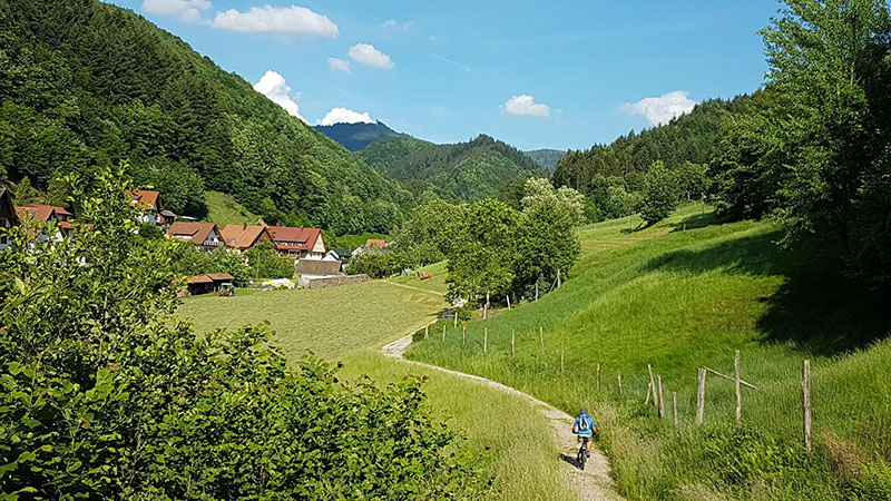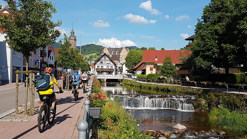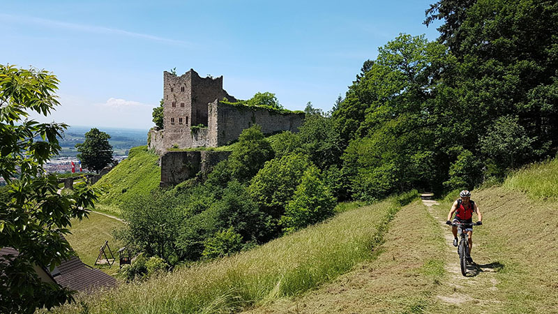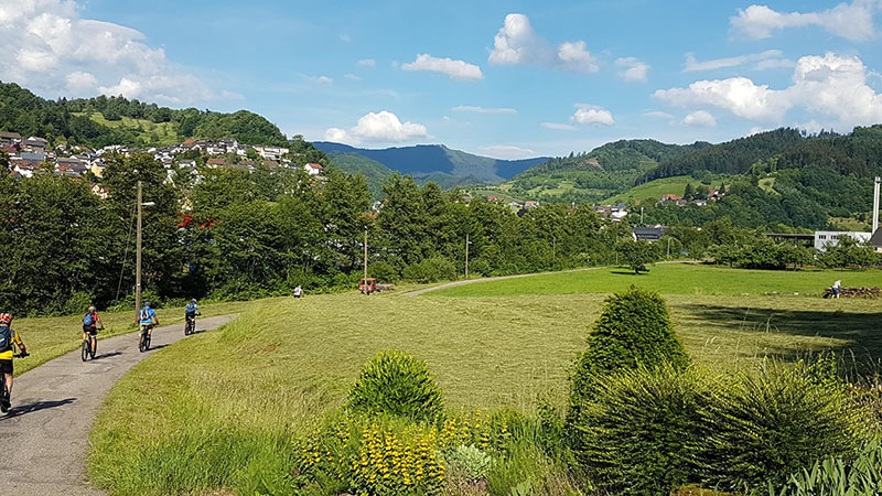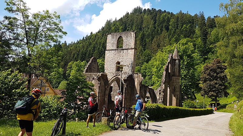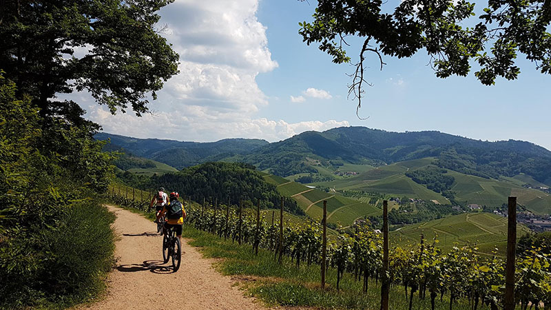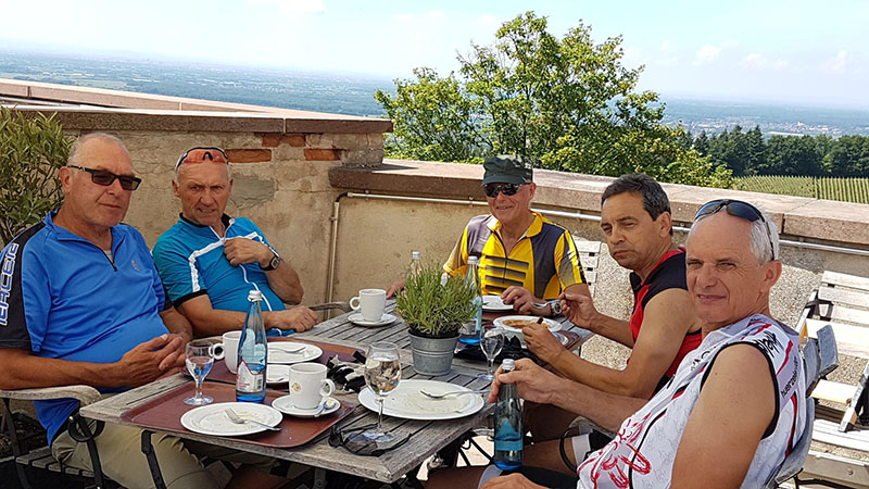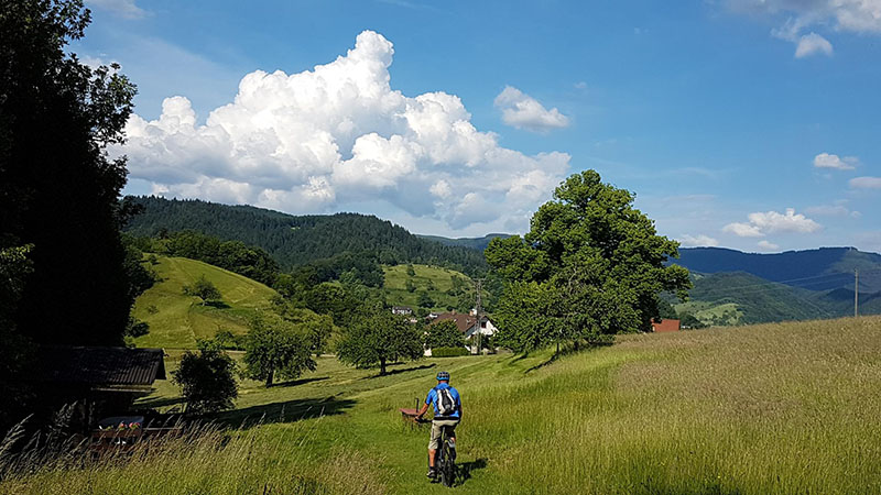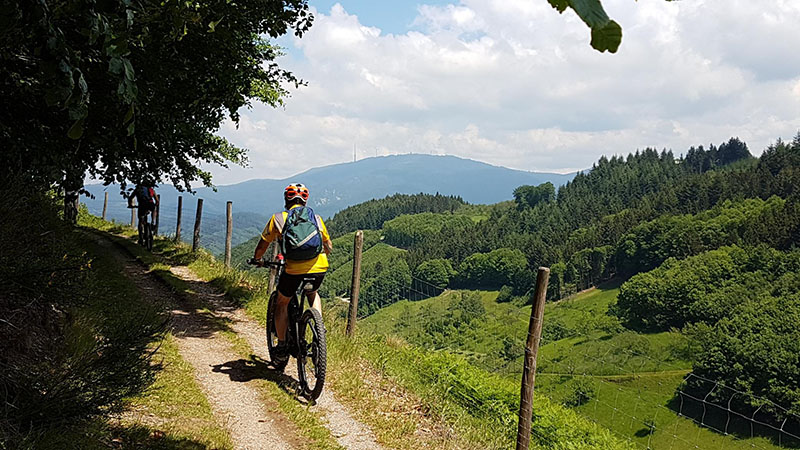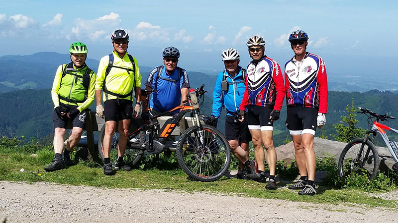 Von der Zuflucht an der Schwarzwaldhochstrasse ging es zunächst aussichtsreich entlang des Wetweges über den Schliffkopf hinunter zu den Allerheiligen-Wasserfällen. Über den Höhenrücken von Sohlberg und Simmersbacher-Kopf führt ein schöner Singletrail hinunter zur Ruine Schauenburg nach Oberkirch. Über Bottenau ging es auf dem Ortenauer-Weinpfad hinüber zum Schloss Staufenberg. Die sonnige Aussichtsterrasse über den Weinbergen von Durbach war der ideale Einkehrort. Die Stärkung war auch notwendig für die folgende 700 Höhenmeter-Auffahrt hinauf auf den Mooskopf mit 871m. Die Panorama-Aussicht war grandios. Vom Straßburger Münster über das Renchtal bis zur Hornisgrinde. Vom Rheintal über das Kinzigtal bis zum Brandenkopf. Nach einer langen Abfahrt nach Oppenau ging es hinein in das Maisachtal und über Bad Antogast vorbei an der Rechtalhütte hinauf zum Buchkopfturm. Die 75 km und 2.200 Höhenmeter Auffahrten sind für die Senioren nur mit Elektro-Unterstützung und Reserve-Akku zu bewältigen.