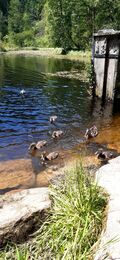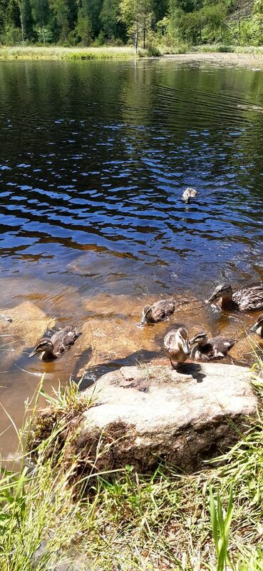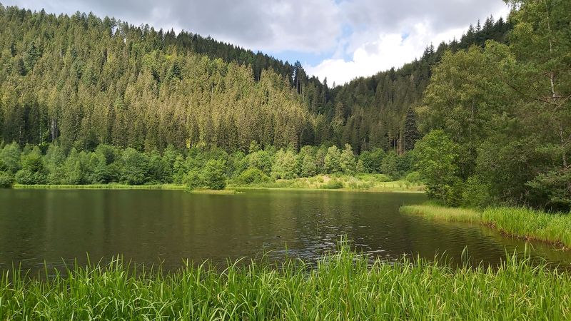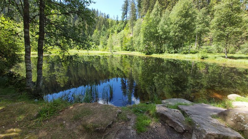 Das Einrollen am kleinen Sankenbach fiel uns nicht schwer und wir zirkelten gekonnt um die Wanderer herum, bevor es auf einem kleinen Wurzelpfad hinauf zum Sankenbachsee ging. Der Blick auf den Sankenbachkessel, der während der letzten Eiszeit entstanden ist, war herrlich. Alles blühte in sattem Grün und die Wolken spiegelten sich auf der Wasseroberfläche. Weiter ging es auf einer Menschenleeren Forststraße hinauf auf den Kniebis. Vorbei an der Aussichtsplattform Ellbachseeblick erreichten wir die Schwarzwaldhochstraße, welche wir überquerten um zum nahegelegenen Moorbad in der Nähe des Hotel Waldblick zu gelangen. Nach einer rasanten Abfahrt hinab zum Ellbachsee machten wir eine kurze Rast und beobachteten eine Entenfamilie.