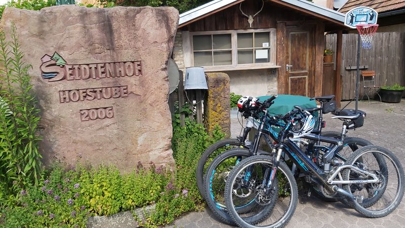 Weiter ging es bergab und gespickt mit schönen Wurzelpfaden nach Mitteltal. Vorbei an der Kirche um am legendären Hotel Bareiss mussten wir uns die verlorenen Höhenmeter auf der gegenüberliegenden Sommerseite wieder erkämpfen. Nach ein paar steilen Rampen erreichten wir die Sattelei-Hütte, in der unsere Einkehr geplant war. Aufgrund des großen Andrangs und der noch geltenden Corona-Verordnungen, bekamen wir keinen Platz und entschieden uns weiter zu fahren. Auf dem Sattelei-Trail ging es in vielen Spitzkehren bergab. Unser nächstes Ziel sollten die Reichenbacher Höfe sein.