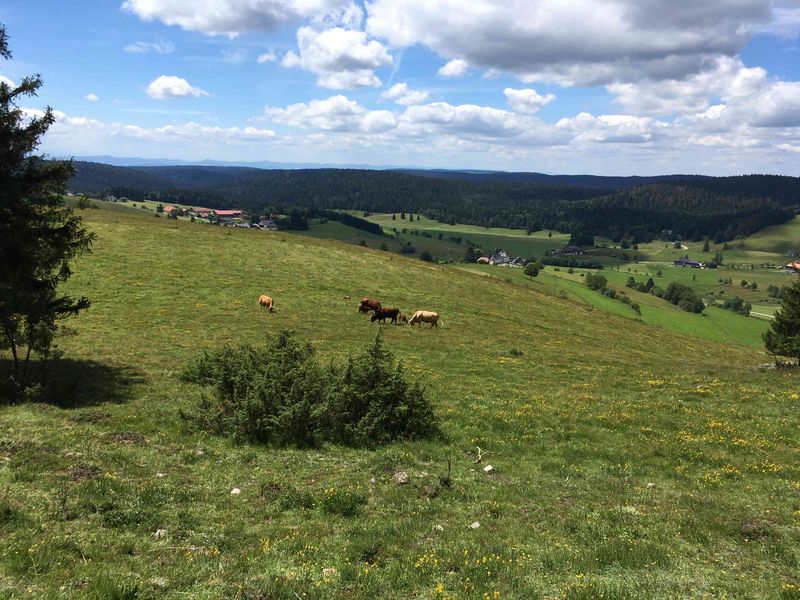Aussichtshütte Mettler mit Brunnen, Blick in die Schweizer Jura, Wanderung auf schmalen Pfaden, tolle Felsformationen im Bannwald, kurzes Teilstück Drahtseilversichert, eine paar grasende Gemsen auf der anderen Talseite im Steilgelände.
