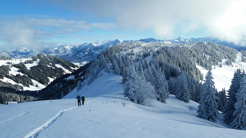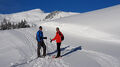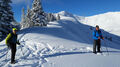 Mit dem Skibus erreichte man von Obermaiselstein die Grasgehrenhütte. Von der sonnigen Südseite ging es hinauf auf das Riedbergerhorn. Etwas unsicher zog man eine neue Spur auf dem teilweise erhebliche überwechteten Grat hinüber zum Großen Ochsenkopf.