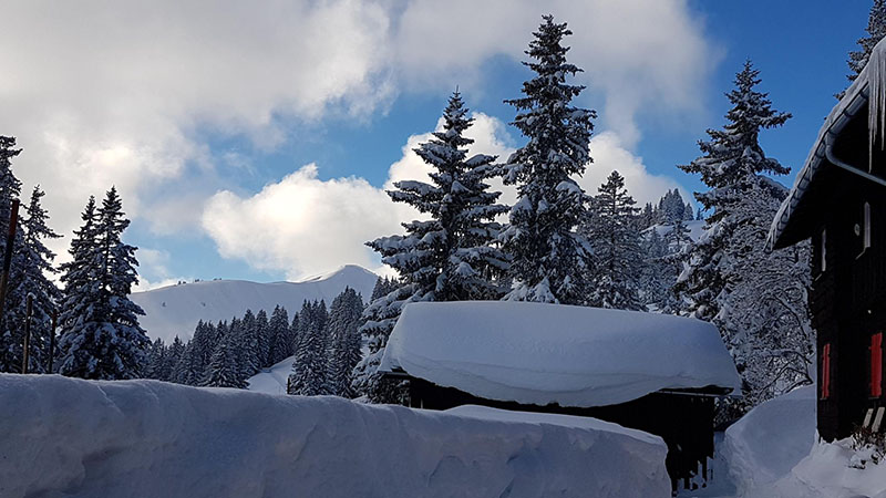 Das Berghaus Schwaben war wie die meisten Gastbetriebe um diese Zeit noch nicht geöffnet so dass das eigene Vesper im Freien eingenommen werden musste. Durch hüfthohen Schnee stapfte man den Steilhang hinunter ins Bolgental und wieder hinaus nach Obermaiselstein.