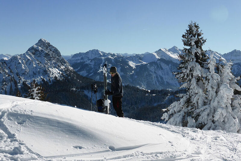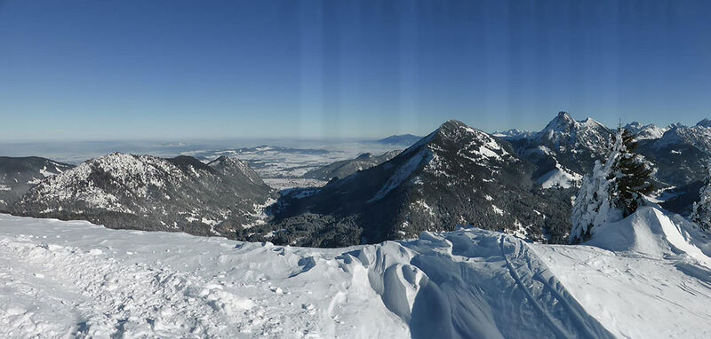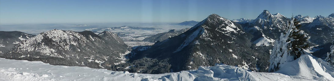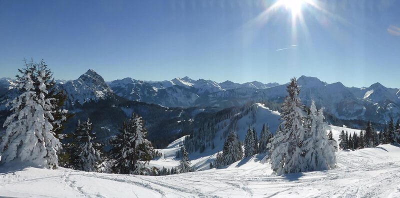 Auf überwiegend waldfreien, sonnenbeschienenen, flachen und somit lawinenfreien Hängen geht es angenehm bergauf zunächst auf den Pirschling 1634m. Von hier hinüber und hinauf auf den Grenzberg Schönkahler (688m). Man genießt einmalige Aussichten auf dem gesamten Aufstieg. Aber die rundum 360° Panorama-Aussichten vom Gipfel sind überwältigend. Von Pfronten im Norden schweift der Blick vom zugefrorenen Forgensee über die Tannheimer Berge hinüber ins Oberallgäu.