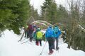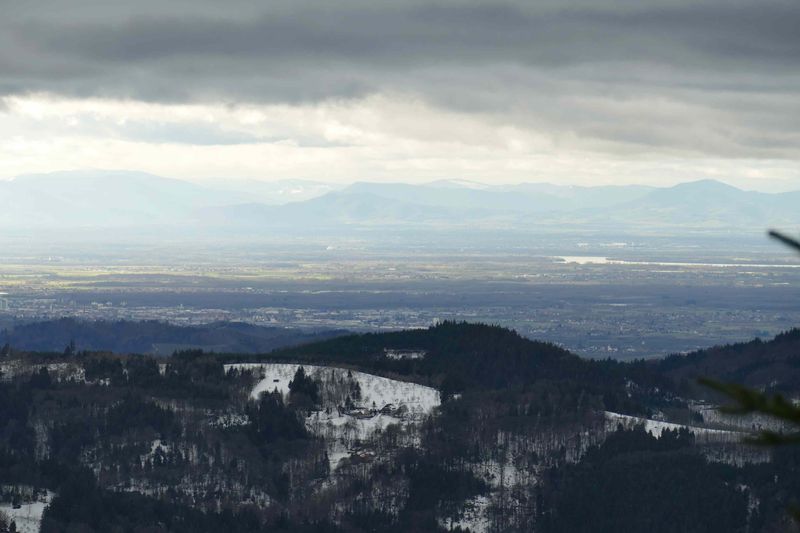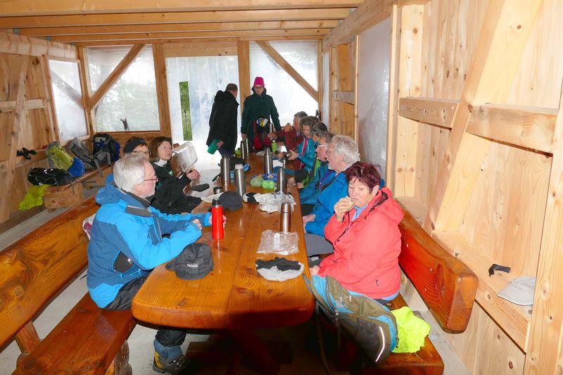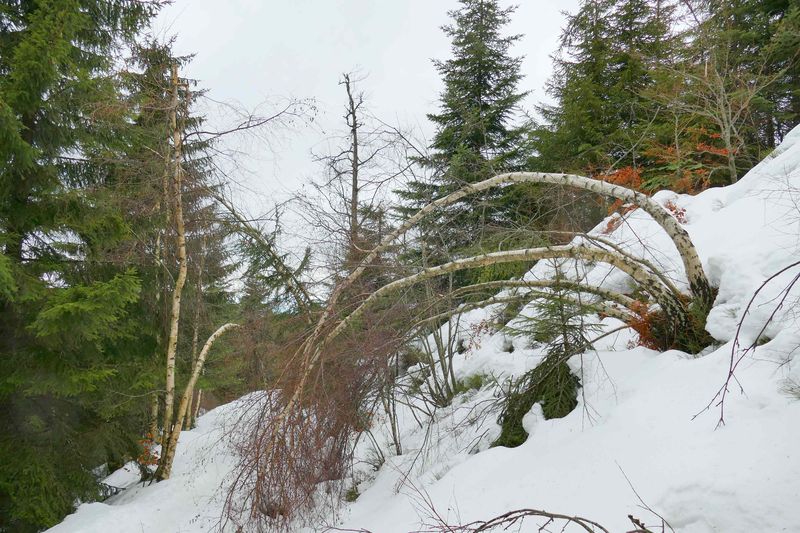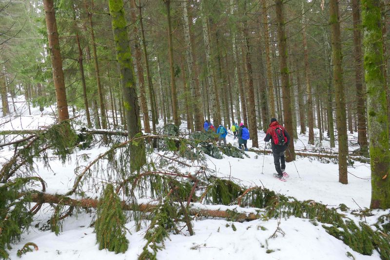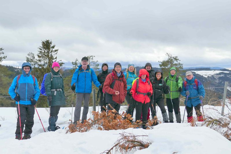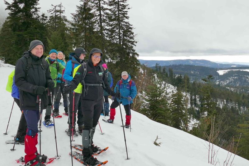Wetterbedingt und wegen „Mehr-Schnee“ hatte Ursel kurzfristig umdisponiert: auf den ausgewiesenen Schneeschuhpfad am Ruhestein. Kurz nach neun fuhren wir ab Nagold und hatten so noch einen guten Parkplatz beim Nationalparkzentrum Ruhestein. Nach Überquerung der B500 legten wir die Schneeschuhe an und gingen auf markiertem Weg auf festem Schnee durch den Wald windgeschützt Richtung Kernhof zum Bosensteiner Eck. Dabei mussten wir zahlreiche umgefallene Bäume über- und untersteigen oder umgehen. Vom Bosensteiner Eck machten wir einen Abstecher zum Brennet Schrofen mit Schutzhütte. Dort stärkten wir uns am mitgebrachten Vesper und genossen anschließend vom davorliegenden Aussichtsfelsen die Ausblicke über Ottenhöfen und den Karlsruher Grat ins Rheintal. Auf aussichtsreichem Weg, teils mit abgebrochenen Ästen und umgebogenem Birken gelangten wir nach 8,7 km wieder zum Parkplatz. Die Rückfahrt unterbrachen wir zur Schlusseinkehr in Obertal beim Wirtshaus zur Sieberei, für kommende Ausfahrten sehr zu empfehlen.