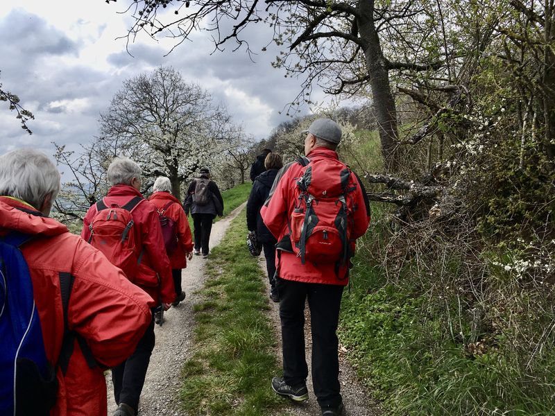 Start war beim Parkplatz am Waldfriedhof in Herrenberg. Die Wanderung führte uns entlang des südlichen Schönbuchtraufs in Richtung Kay. Auf unserem Weg boten sich immer wieder schöne Weitblicke ins Ammertal auf Kay, Mönchberg, und auf die blühende Streuobstwiesen. Der Rückweg führte uns durch die Obstwiesen unterhalb der Traufkante.