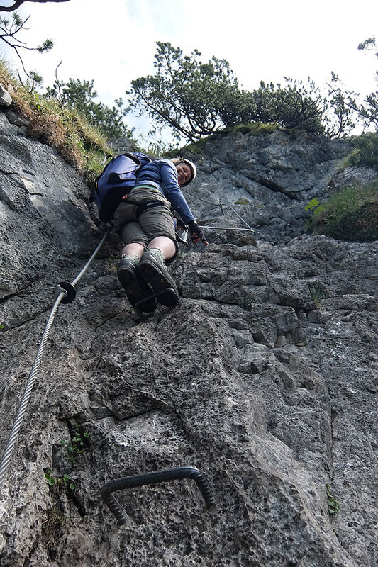 Zum Eingewöhnen folgte leichtes Klettersteiggelände, bis wir an die steile Leiter – dem wirklichen Einstieg des Steigs – kamen. Hier ging es dann richtig los und verlangte enorme Armkraft. Nach kurzer Pause auf einem Bankerl ging es auf gut gesicherten Querungen weiter und die traumhaften Ausblicke auf die drei Seen des Voralpenlandes luden uns immer wieder zum Verschnaufen ein.