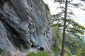 Wir, das waren Stefan, Verena, Andrea, Jürgen, Susanna und Sarah, waren eine kleine überschaubare Gruppe und trafen uns fast pünktlich am Parkplatz der Tegelbergbahn. Nach kurzem sortieren der Rucksäcke ging es auch schon los. Über Leitern, Tritte und Querungen soll uns der Tegelberg-klettersteig auf den Hausberg von Füssen führen. Bis zum Anseilplatz mussten wir erst mal einen knackigen Anstieg von 400 HM bewältigen. Nach kurzer Trinkpause und anlegen der Klettergute, ging es weiter bergan durch einen Wald bis sich die gewaltige Tegelberg Nordwand vor uns aufbäumte und uns mit einem heftigen Steinschlag begrüßte. Dieser jagte uns erst mal einen heftigen Schreck ein, denn genau diese Stelle mussten wir gleich queren. Zum Glück ging alles gut.
