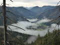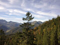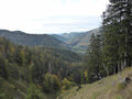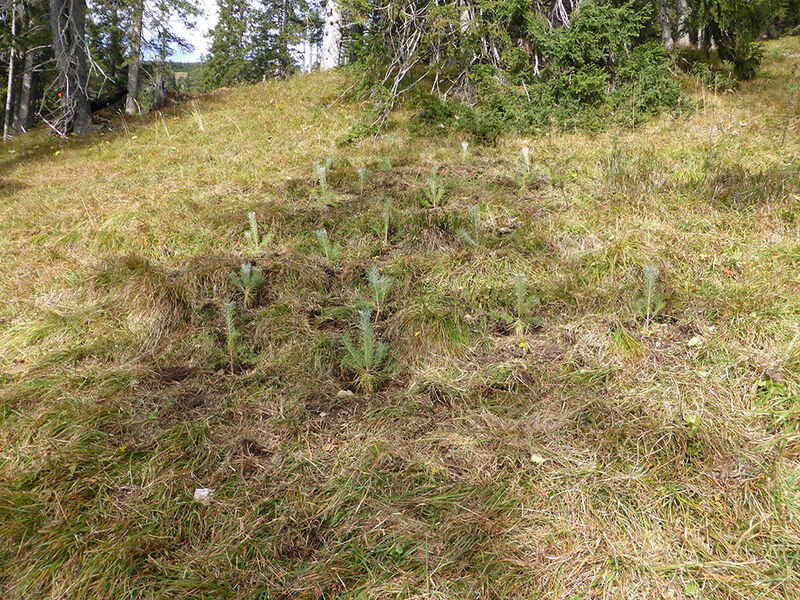 8 Uhr Begrüßung durch Rudi. Für die kommenden Tage sollte der Arbeitsbeginn schon 7.30 sein, weil unsere betreuenden Waldarbeiter sonst auf uns warten müssten. Wir fuhren zunächst drei Kilometer auf Forstwegen, dann liefen wir –bewaffnet mit Hacken- auf einem schmalen Steig fast eine ¾ Stunde 2 Kilometer und 200 Höhenmeter bergauf zu unserem ersten Einsatzplatz: pflanzen. Ein Hubschrauber hatte 600 Lärchen - und Kieferpflanzen mit Ballen geliefert, immer 10 Stück in einem Plastikbeutel. Bei dem föhnigen Wetter genossen wir die Aussicht über den Ursprungpass zu den schneebedeckten Bergen jenseits des Inntals, die bunten Wälder leuchteten in der warmen Herbstsonne.