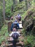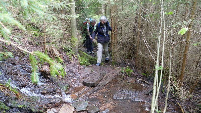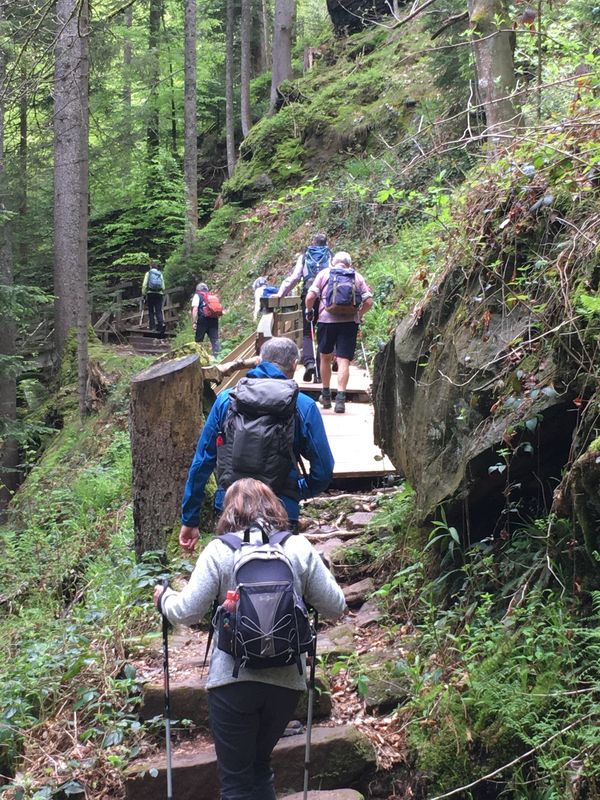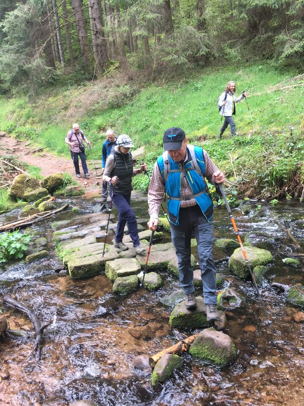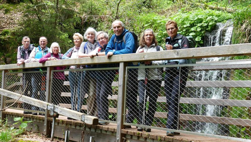Start der 14 Kilometer langen Wanderung war der Bahnhof in Baiersbronn. Gleich zu Beginn überquerten wir den Mühlbach um auf die andere Talseite zum Bachlauf des Sankenbachs zu gelangen. Der schöne Wanderweg schlängelte sich immer am Bach entlang, an saftigen Viehweiden und blühenden Wiesen. Unterwegs konnten wir am gegenüberliegenden Skihang die ersten Gleitschirmflieger-Startversuche der Schnupperkursteilnehmer sehen. Am Waldrand wurde Bachseite gewechselt, die Mutigen balancierten über die großen Bundsandsteine, die anderen wählten die bequeme Variante über die Holzbrücke. Vorbei am Hirschgehege gelangten wir zum Sankenbachsee. Nach der Vesperpause konnte frisch gestärkt der Aufstieg zum Wasserfall in Angriff genommen werden. Willi hat uns in das Geheimnis des Wasserfalls eingeweiht, vielen Dank dafür.