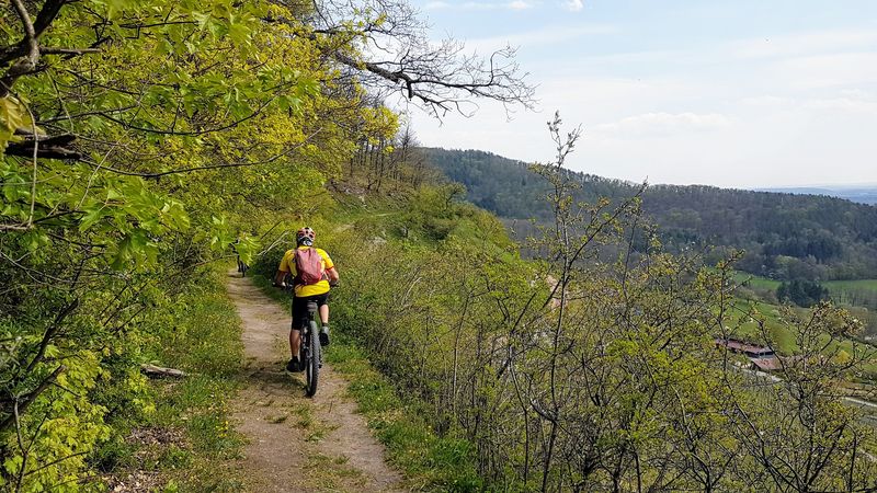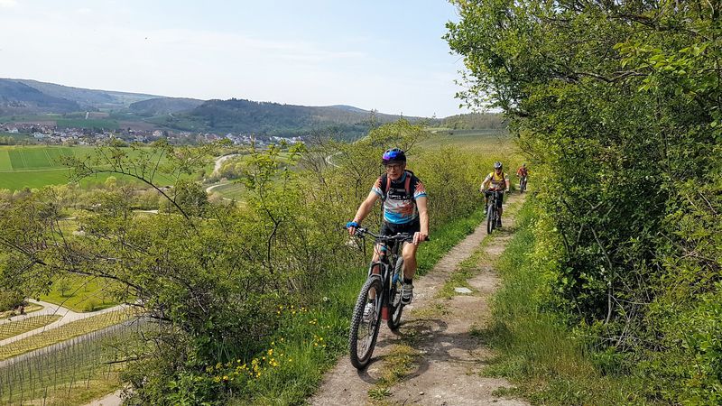 Gleich recht spannend wurde es über den stark verwurzelten Schanzwall der Eppinger-Linie. Die Vollfederungen der Bikes waren gefordert. Nach Maulbronn folgten einige Weinberge von Zaisersweiher und Diefenbach bis nach Sternenfels. Entlang des Rittersprung-Trails hatte man immer wieder schöne Aussichten das Zabergäu hinaus zum Heuchelberg und bis Heilbronn.