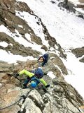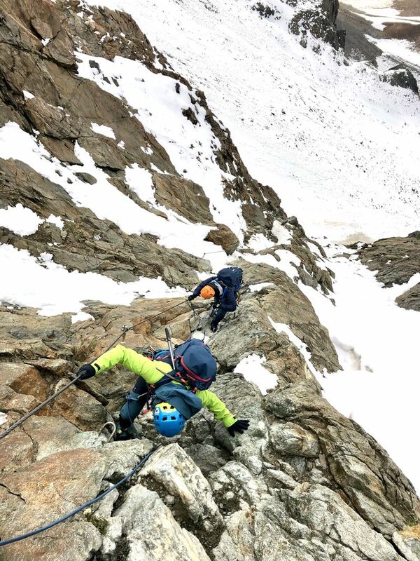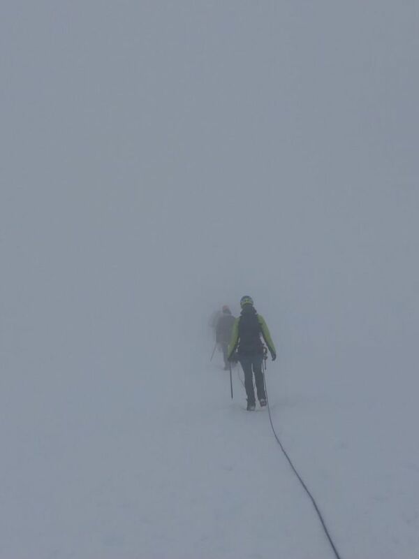 Um fünf Uhr klingelt der Wecker der Gipfelstürmer des DAV Nagold – auf der Hütte ist reger Betrieb am Frühstücksbuffet. Gut gestärkt und mit gepackten Rucksäcken macht sich die Gruppe auf den Weg zum Mitterkarferner, an dem dann Steigeisen und Klettergurte angelegt werden. Die wenigen und teils sehr steilen Meter im Schnee hinauf zum Einstieg des Klettersteiges werden seilfrei gegangen – die Spaltensturz-Gefahr ist hier deutlich geringer als die Mitreiß-Gefahr. Es herrscht schon buntes Treiben am engen Einstieg, aber durch die gute Vorbereitung kann die Gruppe mit angelegter Ausrüstung und griffbereitem Material schnell in den Klettersteig einsteigen und die Passage durchsteigen. Der Ausstieg wird mit einem herrlichen Blick auf den Taschachferner belohnt, der mit den ersten Sonnenstrahlen des Tages beleuchtet wird. Das Seil wird auf den Modus Gletscherseilschaft angepasst und los geht es über die weißen Weiten hinauf zum Südwestgrat der Wildspitze in herrlichem Wetter. An diesem Tag freuen sich viele Seilschaften über die guten Bedingungen, doch die Truppe des DAV Nagold schafft es, wie durch ein kleines Wunder alleine am Gipfel zu sein – den sehr steilen, ausgesetzten Engstellen am Gipfelaufstieg sei Dank. Die Aussicht ist herrlich und alle lassen ihre Blicke über das Ötztal, Pitztal und in die Ferne Richtung Schweiz und Südtirol schweifen – doch nicht lange: Aus ‚über den Wolken‘ wird ‚in den Wolken‘. Der stärker werdende sehr böige Wind treibt Wolken aus dem Tal über den Gipfel. Der Platz rund um das Gipfelkreuz füllt sich und so tritt die Gruppe den Weg zurück zur Hütte an – teilweise mit schlechter Sicht und starkem Wind, aber es bleibt trocken und so kommen die Bergsteiger wohlbehalten zum späten Mittagessen auf der Hütte an. In der gemütlichen Gaststube lässt sich das schlechter werdende Wetter und der einsetzende Regen beobachten, der dann bis in die späte Nacht anhält.