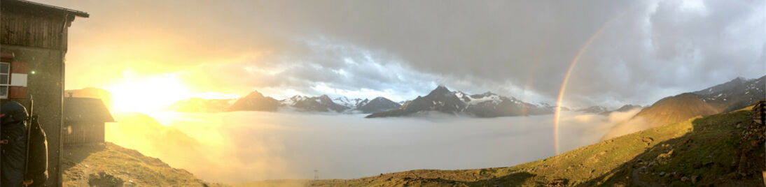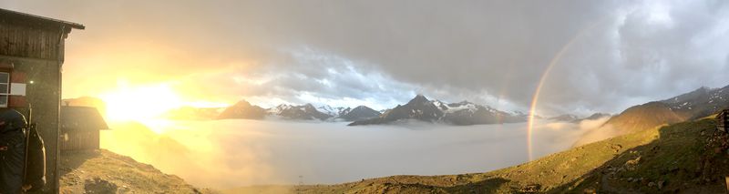 Nach einem frühen Frühstück am nächsten Morgen wird die Gruppe von einem Regenbogen in der Morgensonne an der Hütte verabschiedet und macht sich über nasse Wanderwege auf den Weg ins Tal und auf die Heimfahrt nach Nagold. Die glücklichen Teilnehmer und der Tourenleiter sammeln schon Ideen für die Touren im nächsten Jahr.