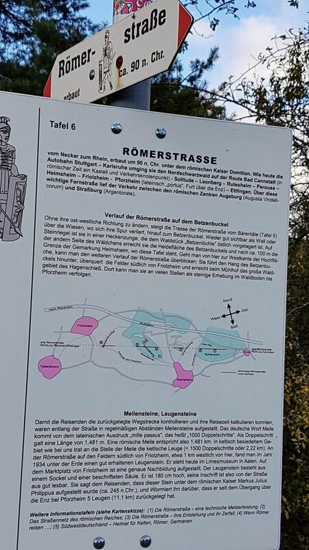In dem schönen Naturschutzgebiet „Betzenbuckel“ wurde eine ehemalige „Römer-Straße“ aus dem Jahre 90 n.Chr. überquert, welche hier an Heimsheim vorbei Richtung Nordwesten führte.