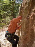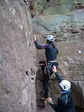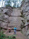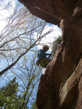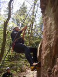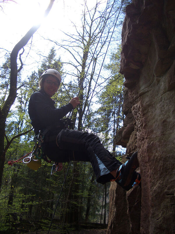 Obwohl es am Vortag noch geregnet hatte, startete der Sonntag überaus sonnig und freundlich. Wir hatten bestes Kletterwetter für unseren ersten Kontakt mit dem Fels. Nach dem Einklettern im Toprope hatten alle schon mal ein Gefühl für ihr neues Spotgerät (den Fels). Freudig wurde das Abseilen unter realen Bedingungen geübt und schnell trauten sich auch die ersten Mutigen an den Vorstieg. Am Ende des Tages waren alle soweit sich dem Vorstieg zu stellen.