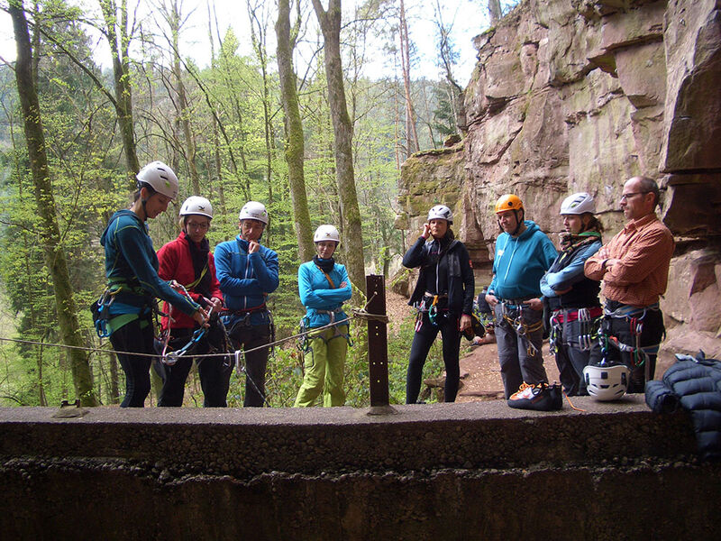 Ziel des Kurses war die Vermittlung der Grundlagen zum Thema Felskletterei. Wo liegen die Unterschiede zur Halle und wie verhalte ich mich in einem Felsklettergebiet? Dieser spannenden Herausforderung stellten sich am 22. und 23.04.17 sieben Teilnehmer. Ein Großteil hatte zuvor den Vorstiegskurs bei Roland belegt und Klettererfahrung in der Halle gesammelt.