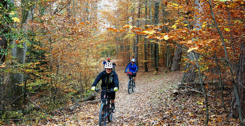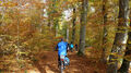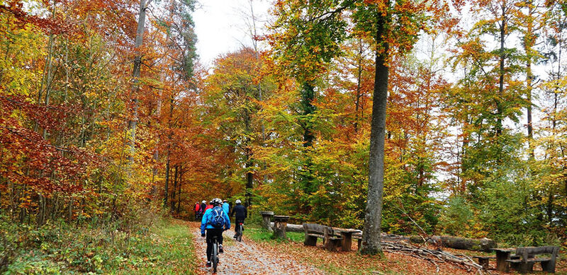 Nach der Aussichts- und Vesper-Pause ging die Tour bei Sonnenschein weiter den Alten Rain hinauf. Hier durch herbstlich bunte Single-Trails über dem Schönbuchtunnel und vorbei am Waldfriedhof auf den HW5 am Schönbuchrand. Vom Grafenberg genoss man noch einmal die Panorama-Aussicht von der Wurmlinger-Kapelle über den Albtrauf und das Stroh-Gäu. Rasch führte der Weg wieder hinunter ins Ammertal nach Altingen. Am Schmalbach vorbei an Tailfingen, den Aischbach und Nebringer-Graben hinauf nach Jettingen. Die Eisberg-Steige hinunter war nach 51 km mit 750 Höhenmeter bald wieder der Ausgangspunkt in Nagold erreicht.