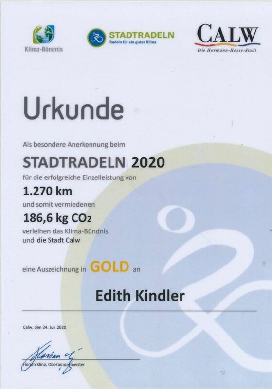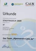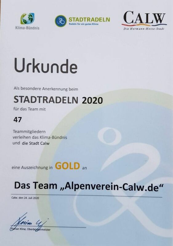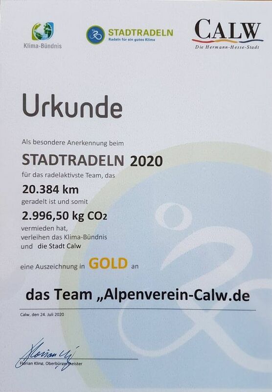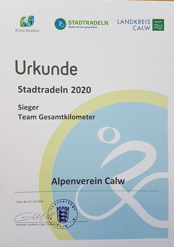 Unsere Donnerstags-Radler des Alpenvereins Calw und Nagold haben beim Stadtradeln 2020 in Calw teilgenommen. Von 165 Teams im Kreis Calw wurden unser Team als Sieger ausgezeichnet mit den meisten (47) Teilnehmern und den meisten (20.000) geradelten km. Als Siegerprämie gab es einen Gutschein des Gasthofes Krone in Wildberg.