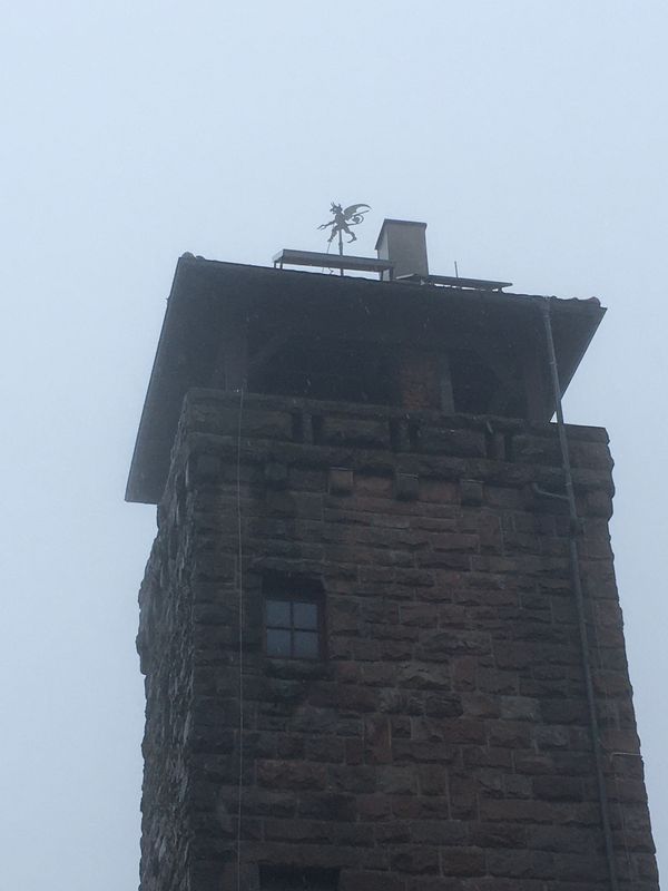 Hier erfolgte der Aufstieg zum höchsten Punkt unserer Tour, der Teufelsmühle mit seinen 908 Metern. Leider war der 1910 gebaute Teufelsmühle-Turm an diesem Tag geschlossen. Geschlossen war nicht nur der Turm, sondern auch noch das Wanderheim. So musste unsere Kaffeepause im wahrsten Sinne ins Wasser fallen, denn ab hier setzte der Regen ein und deshalb ging es auf kürzestem Weg zurück zu den Autos. Regenschirm war zwar Grundausrüstung an diesem Tag, zum Einsatz kam er jedoch erst beim letzten Teilstück.