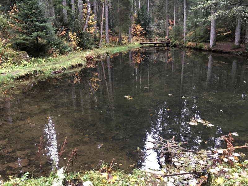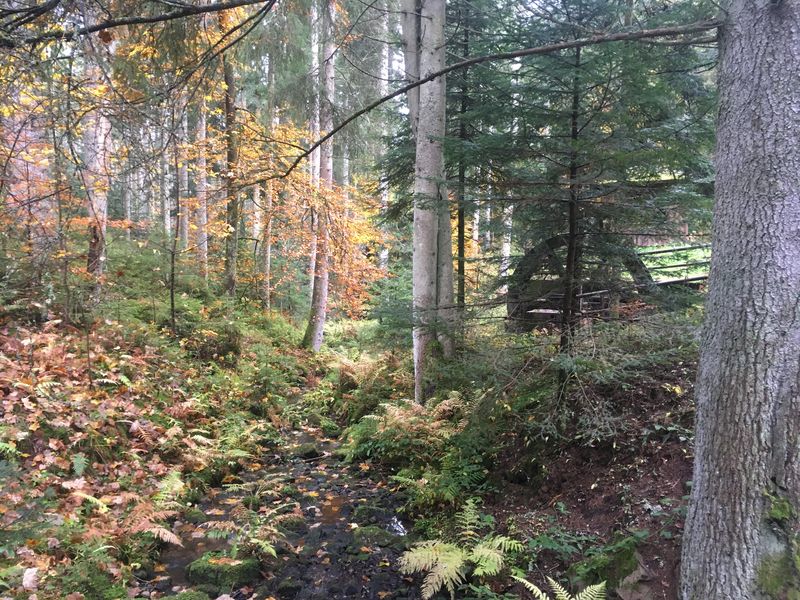Vom Sportplatz Simmersfeld aus sind wir nach schönem Blick auf die Alb in den herbstlichen Wald eingetaucht. Über die Wolfsberghütte ging es zunächst zum Wasserrad, und dann sehr romantisch auf einem kleinen Pfad den Zugbach entlang zum Paradies. Von dort zum Simmersfelder Kreuz und weiter nach Oberweiler. Zunächst auf einem naturbelassenen Weg durch die Wiesen, mit weitem Blick, dann durch Wald, kamen wir zurück nach Simmersfeld. Da kam dann auch die Sonne ein bisschen heraus und spendierte uns ein Feuerwerk von Farben.
