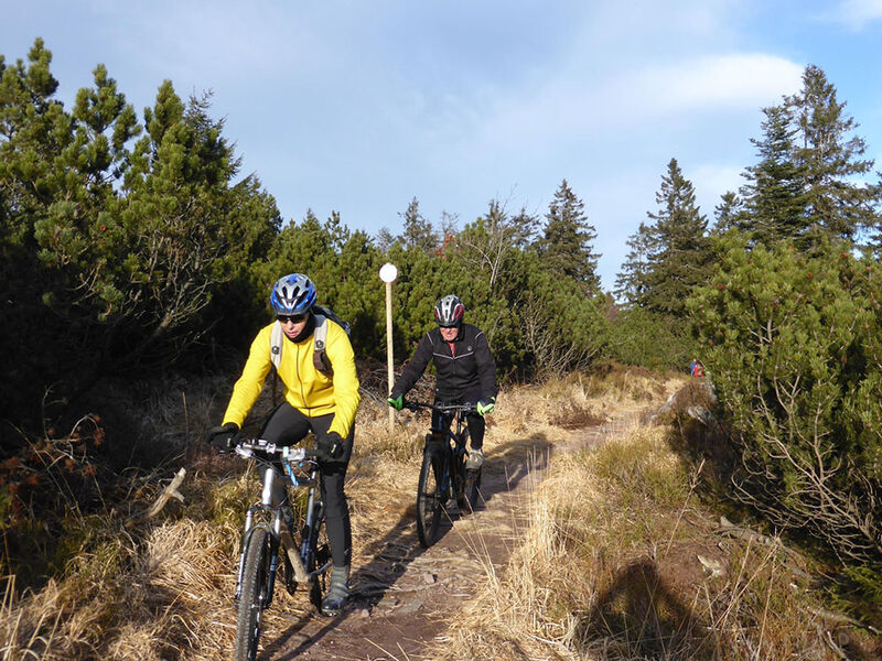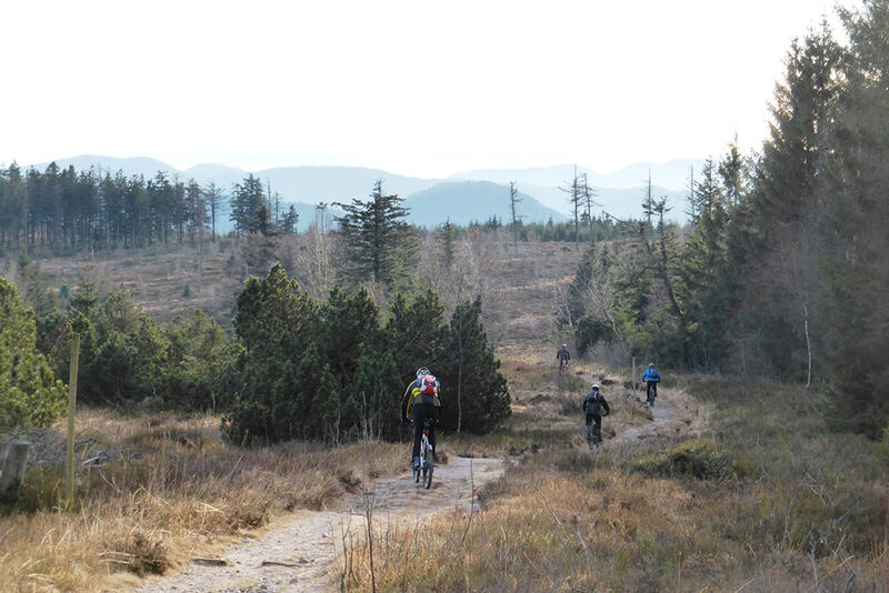 Die 5 Teilnehmer, 3 davon mit Elektro-Unterstützung starteten an der Kniebishütte. Durch das Naturschutzgebiet Schwarzwald-Nationalpark führte die Route meist oberhalb 900 m in der Sonne entlang des Westweges über den Heimatpfad vorbei an der Alexanderschanze, Zollstockhütte und Zuflucht. Vom Sandkopf aus bot sich eine atemberaubende Panorama-Aussicht vom Südschwarzwald über das mit Nebel ausgefüllte Rheintal zu den Vogesen. In 15 km Entfernung schaute das Schloss Staufenberg bei Offenburg-Durbach wie eine Insel aus dem Rheintalnebel heraus. Weiter führte die Panorama-Aussichtstour über den Schliffkopf um den Melkerei- und Vogelskopf zum Ruhestein. Oberhalb des Skihanges ging es über den Seekopf vorbei am Eutingrab mit seiner Aussicht über den Wildsee. Nach der Pause an der Darmstädter-Hütte ging es auf ähnlichem wegen wieder zurück. Von Nordwesten her drücke die angekündigte Schlechtwetterfront heran. Aber zeitig genug konnte man zum Ziel nach 42 km , 700 Höhenmeter und 2:45 h reine Radfahrzeit zurückkehren.