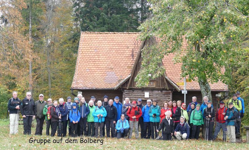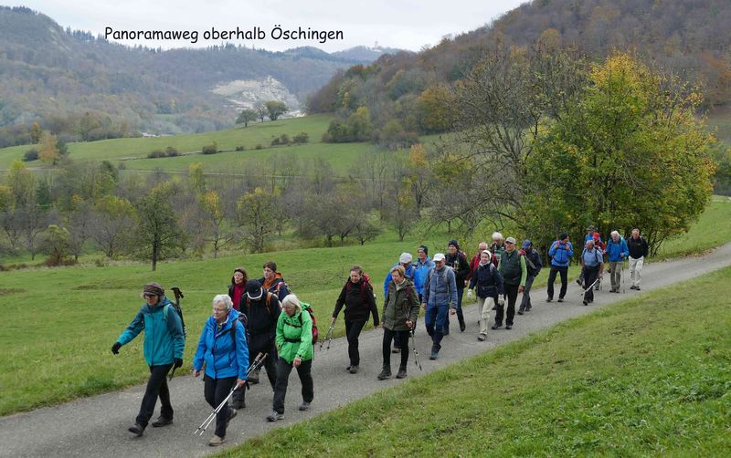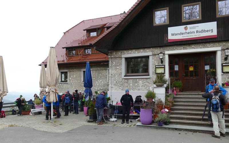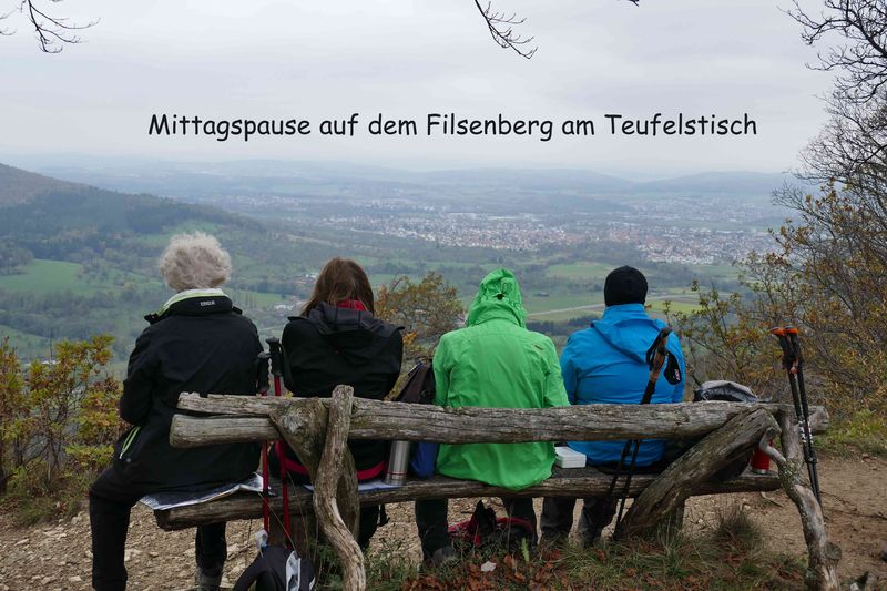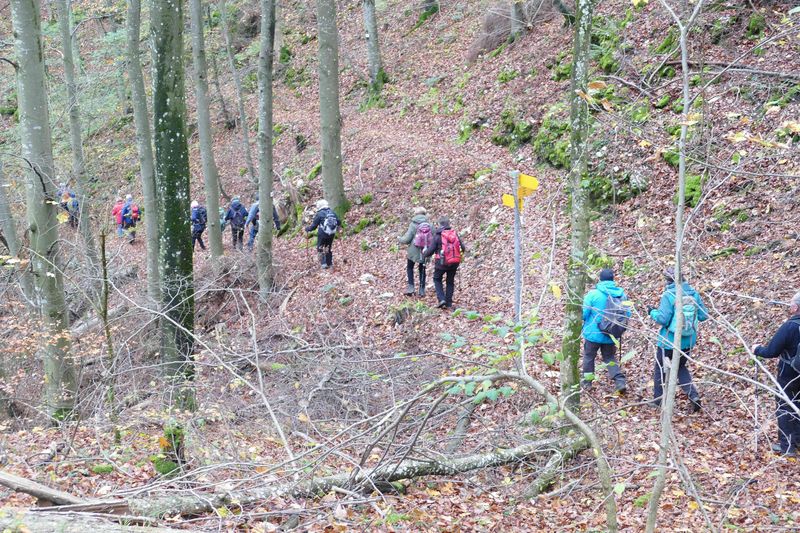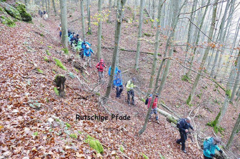 Nach Aufnahme der Essenswünsche bei der Schlusseinkehr begann die Rundwanderung zunächst bequem auf befestigtem Panoramaweg aufwärts. Doch bald zweigte ein schmaler laubbedeckter Pfad ab, der auf den Filsenberg führte. Dort stärkten wir uns nach dem schweißtreibenden Anstieg, warm eingepackt an dem zugigen Aussichtspunkt Teufelstisch. Nahezu eben ging es über den Magerrasen des Naturschutzgebietes Filsenberg, dann folgte nach einem kurzen Abstieg der nächste Anstieg auf den Bolberg. Auch von hier hatten wir eine gute Aussicht ins Tal. Nun kam die schwierigste Etappe des Tages, der steile Abstieg auf rutschigen Pfaden, teils über die Wurzelballen der im letzten Winter durch Schneebruch entwurzelten Bäume. Aber auch dieses Stück hatten wir nach ¾ Stunden geschafft. An der Hirschhütte sammelten wir uns wieder und konnten den letzten Anstieg auf den Rossberg in Angriff nehmen. Leider war das Wanderheim geschlossen, so machten wir auf der Terrasse eine kurze Trinkpause. Am Gedenkstein des Geologen Prof. Quenstedt informierte uns Eckhard noch über den berühmten Erforscher der Alb, dann begann der Rückweg über den kleinen Roßberg zurück runter zur Schlusseinkehr in die Öschinger Krone. Leider mussten wir auf die schon morgens bestellten Speisen recht lange warten, eine einzige Bedienung für uns 40 hungrige Wandersleut war wohl etwas wenig.