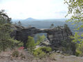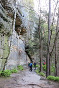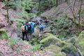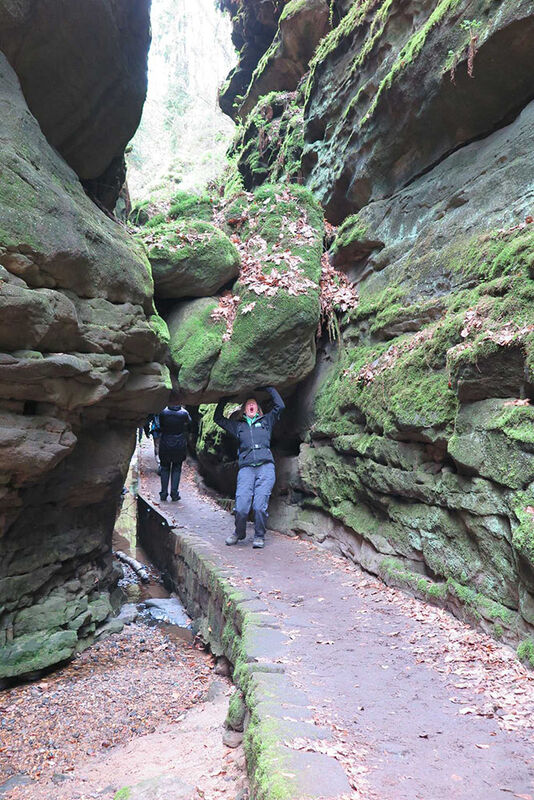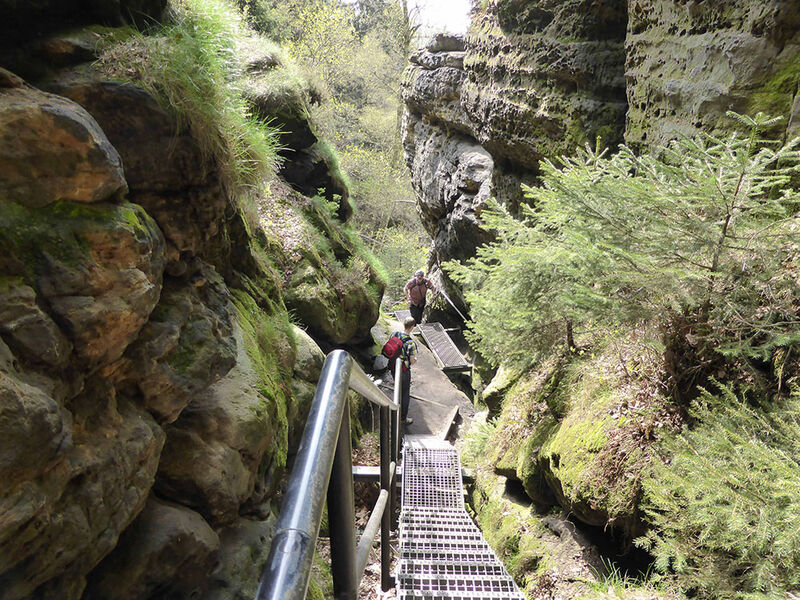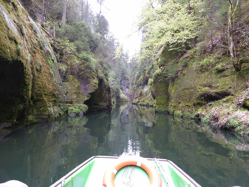 Für Donnerstag war trockenes Wetter wahrscheinlicher. Deshalb konnten wir einen weiteren Höhepunkt der Wanderwoche in Angriff nehmen: Prebischtor und Edmundsklamm in der Böhmischen Schweiz. Wir ließen uns nach Hřensko (Hermeskretschen) in Tschechien bringen. Auf breitem Weg stetig bergan erreichten wir nach einer guten Stunde und 300Hm die größte natürliche Sandstein-Felsbrücke Europas. Rund um das Prebischtor laden viele mit Treppen und Leitern verbundene Aussichtpunkte zum Bestaunen der faszinierenden Landschaft ein. Nach der Mittagspause unter der Felsbrücke führte uns der bequeme, reizvolle Gabrielensteig hinunter zum Touristenzentrum Mezni Louka und weiter in die enge Schlucht des Flüsschens Kamnitz. An einer Bootsstation war der gebaute Fußweg zu Ende, es geht nur mit einem Stocherkahn weiter. Nach 600m auf der Wilden Klamm stiegen wir wieder aus, durch einige Tunnel und Felsgalerien gelangten wir zur Bootsstation der Edmundklamm oder Stillen Klamm. Die tschechische „Gondolieres“ erzählten in der romantischen Klamm lustige Geschichten und ließen sogar einen Wasserfall laufen. Vom Ausstieg bis nach Hřensko an der Elbe war es dann nicht mehr weit, und wir ließen uns nach Regulierung des Flüssigkeit-Haushalts abholen. 22 Kilometer und 505 Höhenmeter in den Beinen, zwei Bootsfahrten und die zwei extrem unterschiedlichen Landschaften lassen uns diesen tollen Tag so schnell nicht vergessen!
