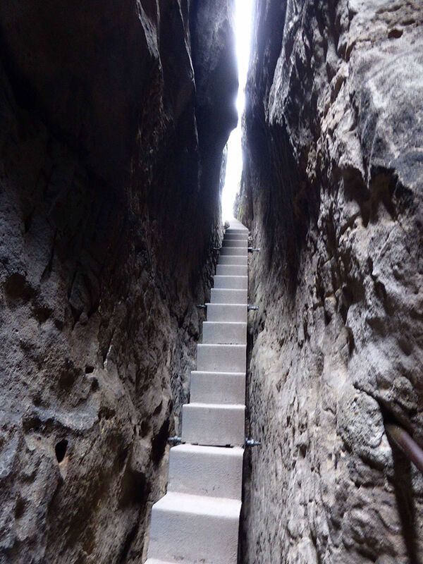 Das Wetter machte noch mit, und so machten wir am Dienstag gleich die Königs-Etappe von der Ostrauer Mühle über die Schrammsteine nach Neumannmühle. Unser Shuttle brachte uns zum Ausgangspunkt, um 9.20 begann der Aufstieg an interessanten Felsformationen vorbei. Über den Wildschützensteig mit steilen Treppen und Stahl-Leitern gelangte man 100m höher zur grandiosen 360-Grad Schrammstein-Aussicht. Dieser Aussichtspunkt mit beeindruckendem Tiefblick ins und übers Elbtal ist wohl der Höhepunkt des Malerweges. Geniale Aussichten gab es auf dem Weiterweg zur Mittagspause auf der „Breite Kluft Aussicht“, dann stiegen wir wieder ab ins Kirnitzschtal zur Pause am Lichtenhainer Wasserfall. Alle halbe Stunde wird „gezogen“, dann kommt für kurze Zeit ein starker Wasserfall. Anschließend wird das Wasser dann wieder 28 Minuten gesammelt. Wieder folgte ein Anstieg, jetzt zum Kuhstall, einem großen Felsentor. Über die Himmelsleiter – schmal, steil, 30m hoch – gelangt man auf den Kuhstall mit schöner Aussicht. Wieder abwärts ins Kirnitzschtal und zur Neumannmühle, wo wir uns nach 20km und 775Hm in stetigem Auf und Ab gegen 17 Uhr abholen ließen. Ein toller Tag, wo alles Spitze war: Landschaft, Wege, Aussicht und: trocken!