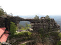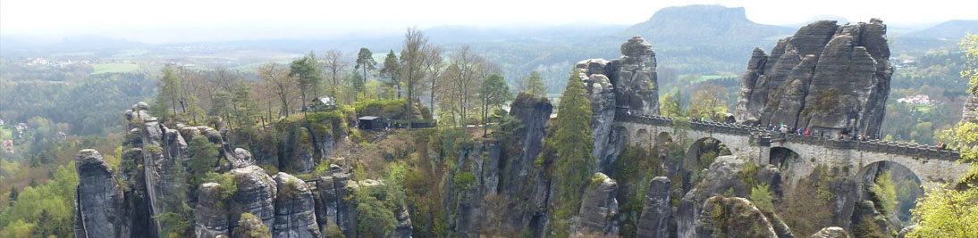 Sonntags brachten uns unsere Hoteltaxis nach Lohmen auf die erste Malerweg-Etappe. Aprilwetter war angesagt, aber unsere Wanderstrecke war ja ans Wetter angepasst. Durch die dunkle Felsschlucht des Uttewalder Grunds mit dem Uttewalder Felsentor gelangten wir zur Burgruine mit schöner Aussicht auf Wehlen mit der Elbe. Das „Wehlenschauer“ überstanden wir bei Kaffee und Kuchen im Café am Marktplatz, bevor es in der Sonne auf der zweiten Malerweg-Etappe aufwärts zur Bastei ging. Bei der Mittagspause am „Steinernen Tisch“ erwischte uns das „Mittagsschauer“, das wir überdacht an der Baude überstanden. Weiter in der Sonne erreichten wir die Bastei mit dem „Bastei-Schauer“. In der Sonne genossen wir die spektakuläre Bastei-Aussicht, beim Rundgang boten sich fantastische Rundblicke in die eindrucksvolle Felslandschaft. Auf dem Bastei-Weg gelangten wir in den Kurort Rathen. Das „Rathenschauer“ verbrachten wir warm und trocken bei Kaffee und Kuchen hinter Glas am Elbufer, während die Wege von Graupel allmählich weiß wurden. In der Sonne führte der Weg an der Felsenbühne vorbei zum Amselsee, Dort wechselten wir vom ausgeschilderten Malerweg auf den Pionierweg zum Hockstein, über die Teufelsbrücke und steile Treppen abwärts durch die Wolfsschlucht ins Polenztal und durch Schindergraben und Bärengarten aufwärts zur Burg und ins Hotel, wo wir uns nach 20km und 630Hm zunächst bei einem Hopfengetränk erfrischten.