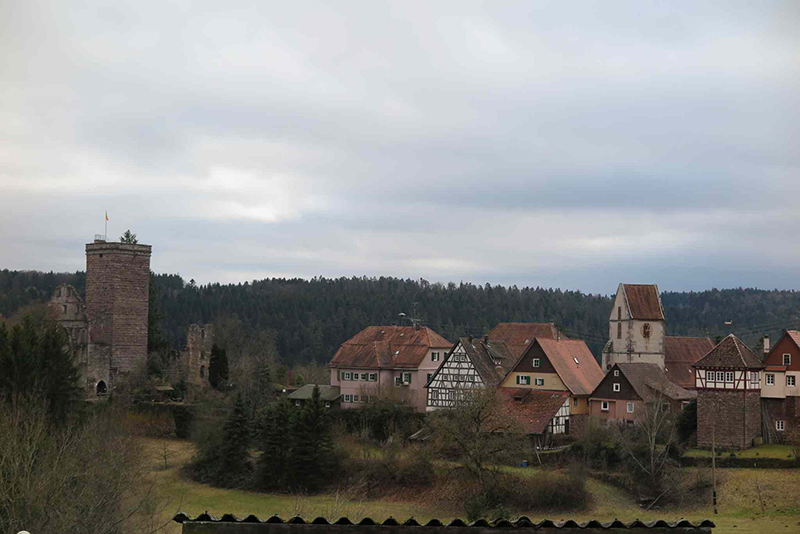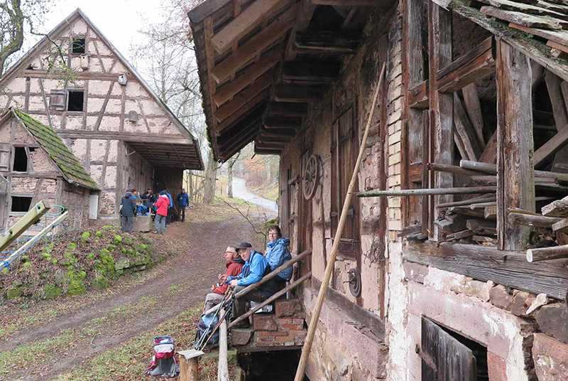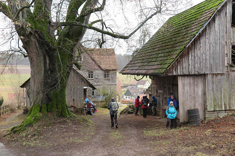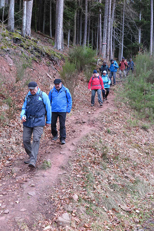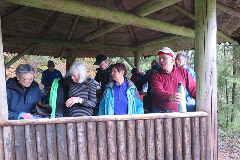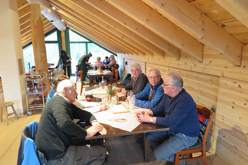 Es dauerte eine Weile, bis wir uns gefunden hatten: Ein Teil hatte der ersten Ankündigung geglaubt und wartete auf dem Bad Hotel Parkplatz, die anderen hatten die zweite mail gelesen und parkten auf dem Freibadparkplatz. Aber wir fanden zusammen, und los gings durch den Ort ins Rötenbachtal. Entlang des Bachs gingen wir auf schmalem Pfad aufwärts durch die Wolfsschlucht zunächst zur Berghütte. Trinkpause, schöne Sicht übers Tal nach Zavelstein. Auf dem Weiterweg nach Emberg stellten wir fest, dass wir nicht mehr vollzählig waren. Gab es doch noch Wölfe in der Wolfsschlucht? Unsere Angst verflog, als einer nach dem andern wieder auftauchte und wir weitergehen konnten. In Emberg begegneten wir einer Kindergartengruppe beim Ausflug. Die tatsächliche Windstärke war wohl doch nicht so stark wie die gefühlte, denn die Kinder konnten sich gut auf den Füßen halten. Interessante Ausblicke auf freiem Feld auf die umliegenden Dörfer auf der Höhe, dann führte der Weg in den Wald weiter nach Rötenbach. Dort vesperten wir an der 400-jährigen Jahrhundertlinde an einer alten, fast baufälligen Scheune. Nach kurzem aussichtreichen Abschnitt gingen wir durch den Wald zum Aussichtspunkt Zettelberg. Die Erstellung des Selbstauslöser-Gruppenfotos nahm wegen verschiedener Schwierigkeiten (aufgehängte Kamera schwankte im Wind) etwas längere Zeit in Anspruch, bevor wir auf abgeändertem Weg im Wald bis zu den Zavelsteiner Krokuswiesen gelangten. Auf freiem Feld gingen wir am Spinnerin-Kreuz vorbei nach Zavelstein, und an der Burg vorbei steil abwärts auf schönem Pfad zur angenehmen Schlusseinkehr in die Schlossberghütte. Neben der Blockhaus-Architektur aus heimischen Tannenstämmen war auch die Ausstattung der Sanitärräume sehr interessant. Nach angenehmem Aufenthalt traten wir zufrieden den viertelstündigen Rückweg zu den Autos an.