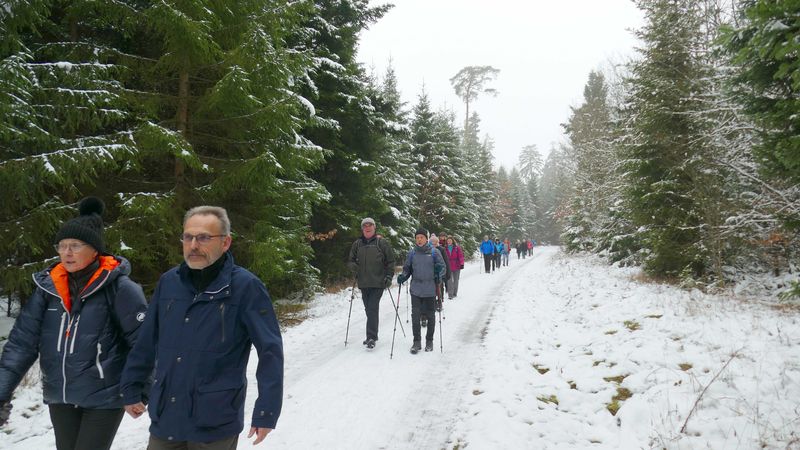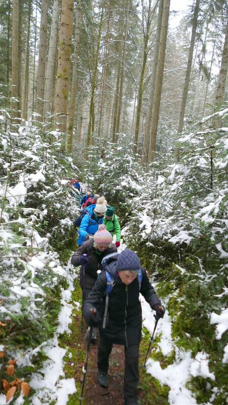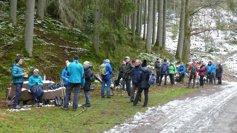 Um 12 Uhr belegten wir den Parkplatz „Traube“ mit 13 Autos. Über den Rathausplatz gelangten wir über etliche Treppenstufen an der „Mittleren Reutte“ zum ausgeschilderten Rundweg. Nach der Straßenüberquerung tauchten wir auf schönem Pfad ein in den winterlichen Zauberwald. Steil abwärts gelangtem wir auf das malerische Hirschbachbrückle und folgten dem Bach bis ins Bömbachtal. An der Sitzgruppe aus massivem Sandstein stärkten wir uns für den Anstieg auf schmalem Pfad zum Naturschutzgebiet „Egenhauser Kapf“. Auf breitem Forstweg mit Blick auf Walddorf kamen wir nach Monhardt und weiter abwärts zur Monhardter Wasserstube. Entlang der Nagold gelangten wir zum Wasserkraftwerk und weiter zum Parkplatz am Klärwerk. Dort überquerten wir die Bundesstraßen, gingen auf dem Wanderweg bis zum Kreisel eingangs Altensteig, querten abermals die Straße und liefen aufwärts zum Ausgangspunkt an der „Mittleren Reutte“. Eckhart gab einen kurzen Überblick über die Geschichte Altensteigs, dann ging´s nur noch hinunter zur Schlusseinkehr in der empfehlenswerten „Traube“.