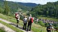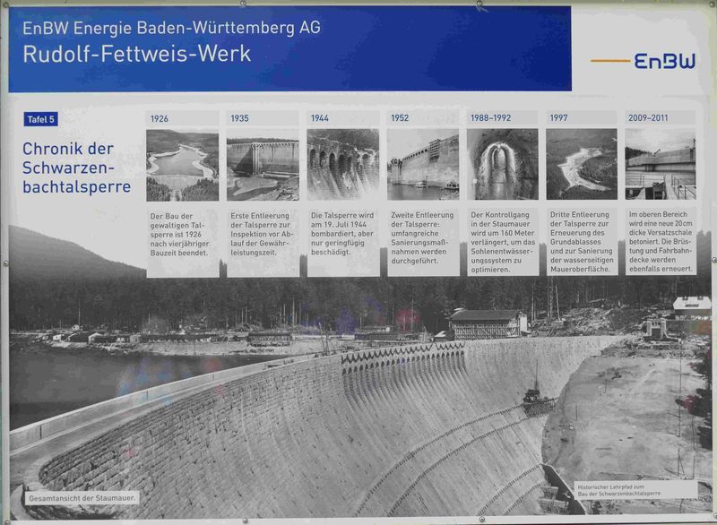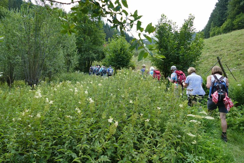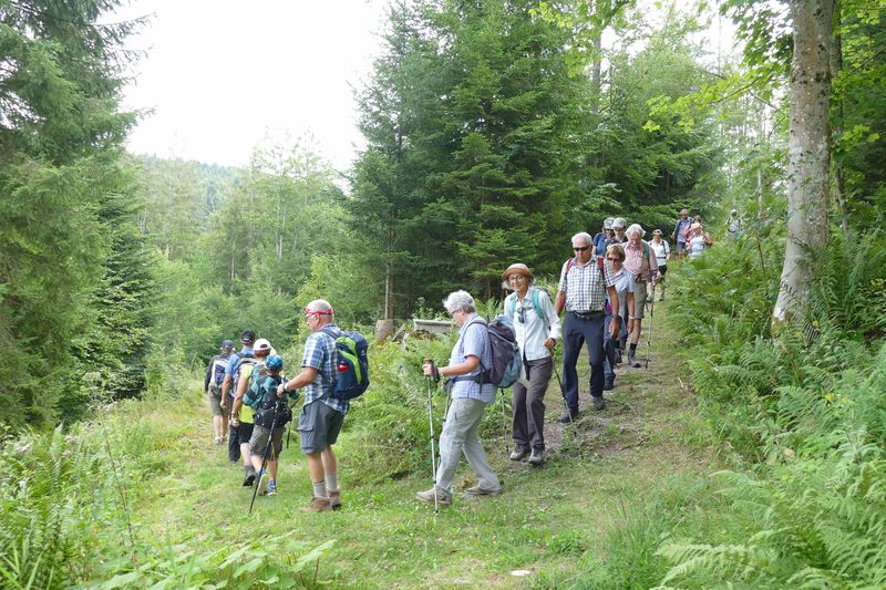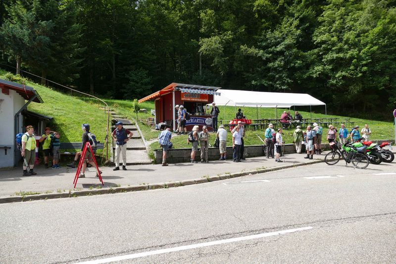 In Forbach trafen wir auf die noch fehlende Fahrgemeinschaft. Über die historische Holzbrücke gelangten wir in die Stadt, von da an ging´s bergauf. Zunächst zur Marienkapelle mit wunderbarem Ausblick auf Forbach, dann weiter auf dem Westweg zum Wasserschloss mit der beeindruckenden Rohrbahn des Pumpspeicherkraftwerks an der Murg. Das Wasserschloss dient keinen Wohnzwecken, hat auch keine Zimmer, sondern gleicht Druckschwankungen in der Rohrleitung zum Kraftwerk aus. Weitgehend eben gelangten wir zur Schwarzenbachtalperre mit interessanten Schautafeln über Bau und Zweck des größten Stausees im Nordschwarzwald. Am Kiosk mit Blick auf den See erholten wir uns während der Mittagspause von dem anstrengenden Anstieg über fast 500 Hm.